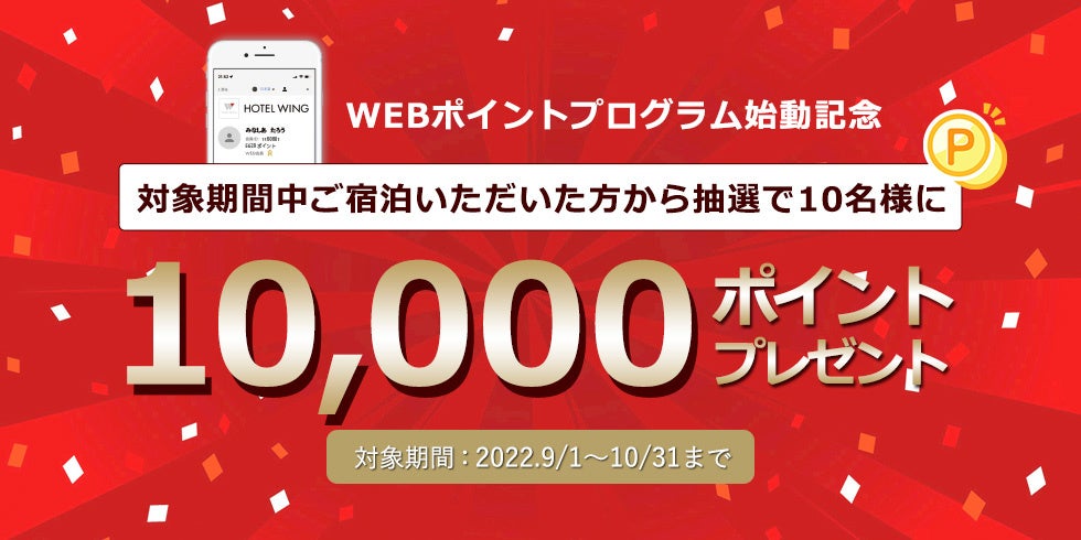 新ポイントプログラム始動を記念し、2022年9月1日(木)より、10,000ポイントプレゼントキャンペーンを実施いたします。会員登録のうえ対象期間内にご予約&ご宿泊いただいたお客様の中から抽選で10名様に10,000ポイントをプレゼントいたします!