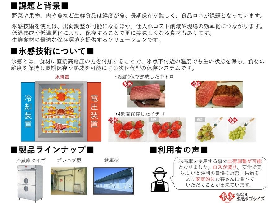 て、食材・食品の「鮮度保持」に加え「熟成」、「高品質解凍」を実現する氷感庫を本イベント内に展示し
