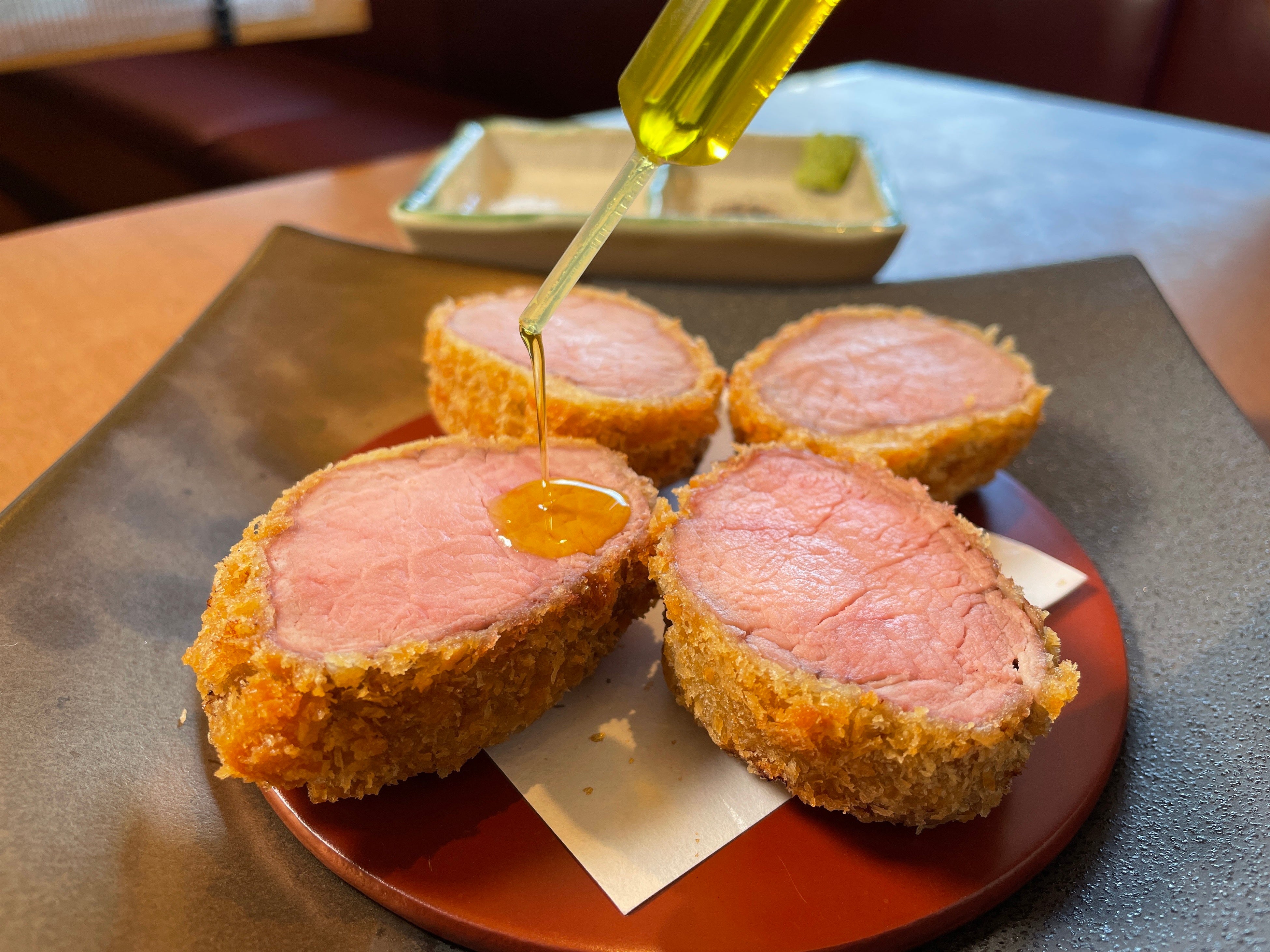 極ヒレかつの断面にオリーブオイルを垂らして適量の塩をつけて