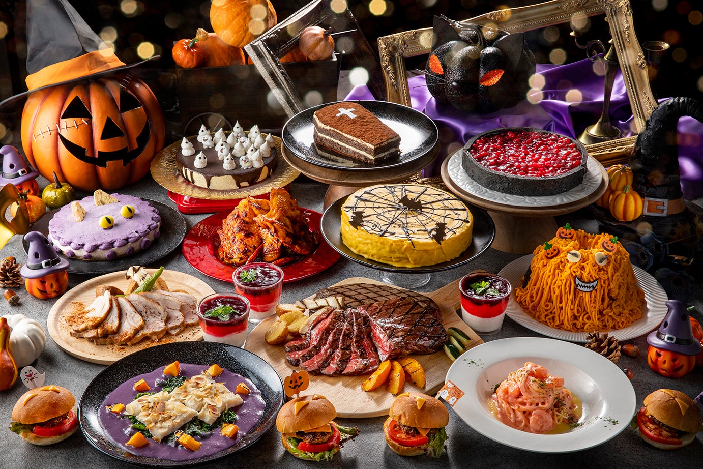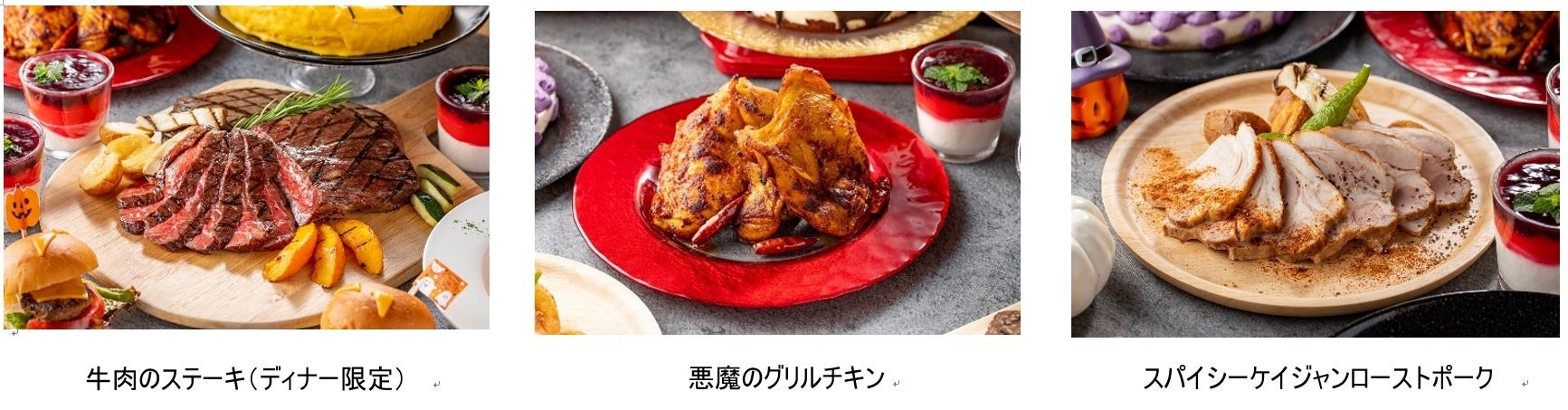 栗と茸のキッシュ、秋鮭とブロッコリーのムース、かぼちゃとクリームチーズのサラダ シナモン風味、さつまいもとイチジクのコンポート、紫キャベツとにんじんのラぺ、ローストビーフ、スパイシーケイジャンローストポーク、悪魔のグリルチキン、ピッツァ 茸&ガーリック、いか墨のブラックピッツァ、ペンネ かぼちゃのクリームソース、ジャック・オ・ランタンのハンバーガー、パンプキンのポタージュスープ、ブラックキーマカレー&ターメリックライス