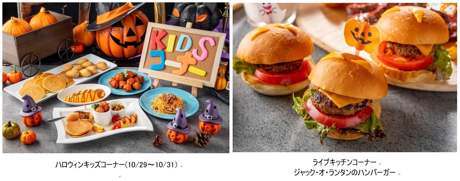 ライブキッチンからは焼きたての「ジャック・オ・ランタンのハンバーガー」をご提供します。卵とバターをたっぷり使用したブリオッシュにライブキッチンの鉄板で焼いた牛肉100%のハンバーグ、チェダーチーズをサンドして特製ソースをかけたミニハンバーガーです。ブリオッシュにのせたチーズの目はジャック・オ・ランタンの顔を表現しています。「オバケを食べてやっつけろ!」という意味を込めています。テーブルで待ちきれないお子様には大人と一緒にビュッフェでお好きなお料理をお好きなだけ取れるように、キッズコーナーをご用意しました。アメリカンドッグやパンケーキ、スパゲティ、オムライス、ミートボールなどお子様好みの5種のお料理をお楽しみください。