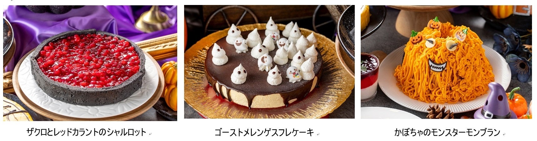 「ゴーストメレンゲスフレケーキ」は、牛乳やホワイトチョコレートを使用したミルキーなスフレケーキにミルクチョコレートのグラサージュをまとわせました。メレンゲで作るオバケは口どけとハロウィン感をアップさせています。「かぼちゃのモンスターモンブラン」は、ふわふわのシフォンケーキをベースにかぼちゃと脂肪分低めの生クリームで作るモンブランクリームを豪快に絞った一品です。見た目ほど重くはなく、口当たりの軽いシフォンケーキと秋の味覚を味わっていただけるデザートです。