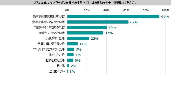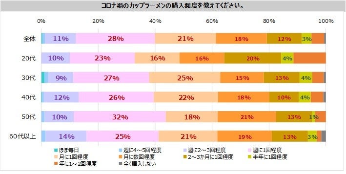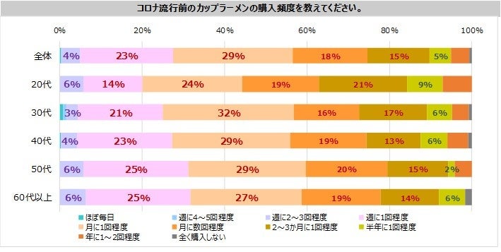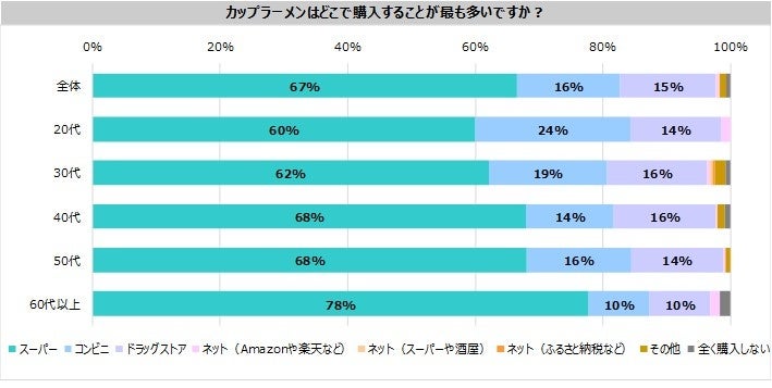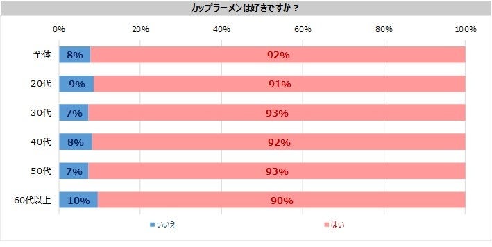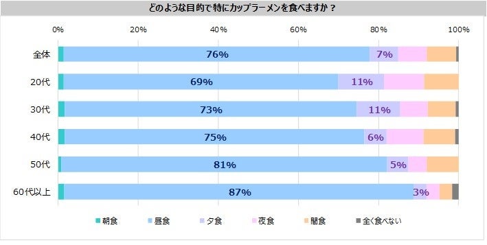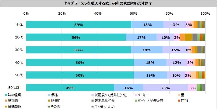 本調査ではこれ以外にカップラーメンを食べる頻度や名店コラボのカップラーメンについてなど全25問で回答を得て、年代別、性別、職業別、既婚・未婚別に集計しています。