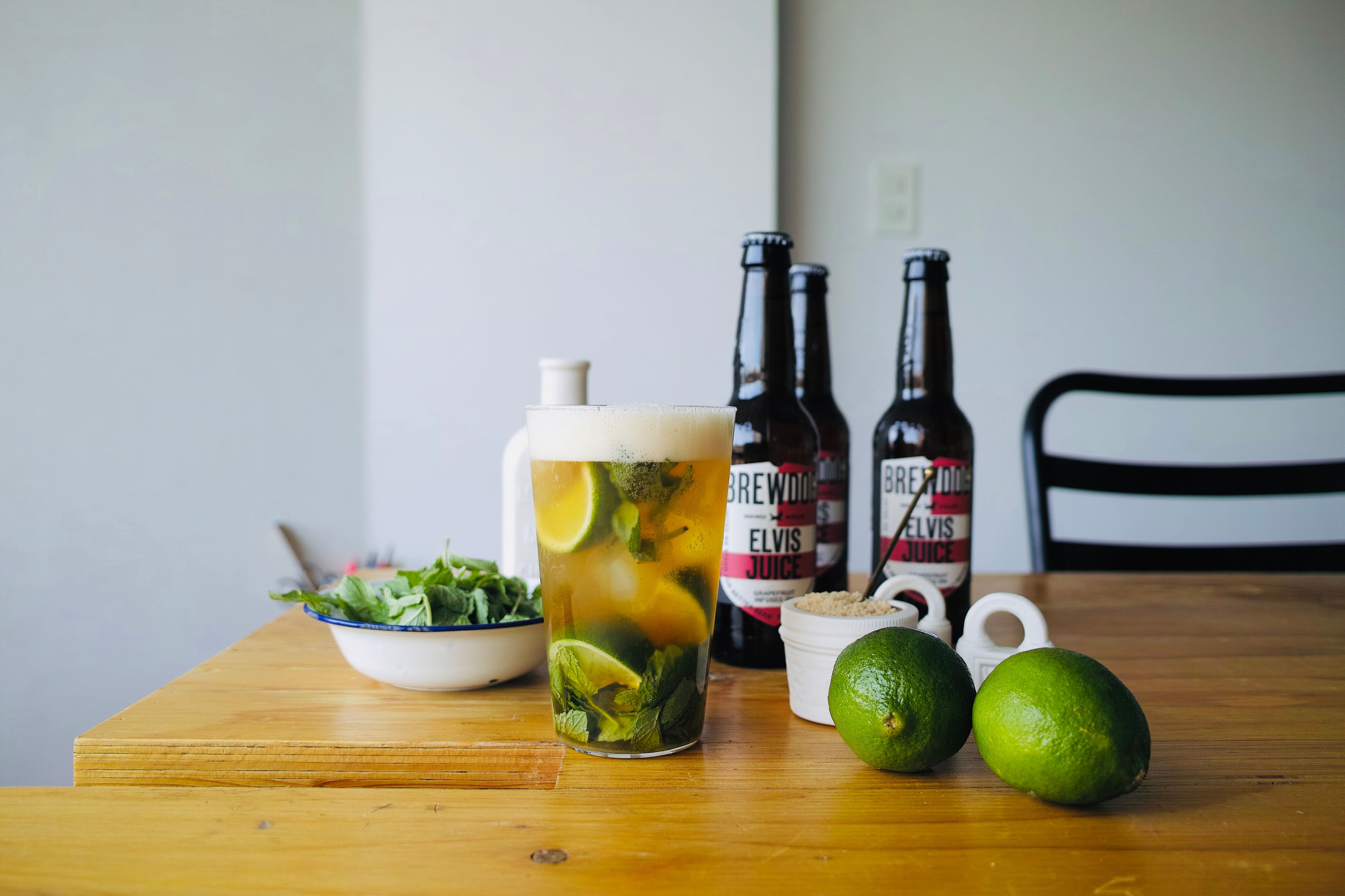 ELVIS JUICEに加えられたイエローの柑橘との相性を考え、フレッシュミントとライムのグリーンを加えカラーコントラスト深くすることで、上品なビアカクテルを組み立ててみました。ブラウンシュガーとミントをすり潰し、ホワイトラムでフォーティファイドさせることでモヒートと、ELVIS JUICEの特徴をお互いにリーチし合うカクテルへ変化させました。