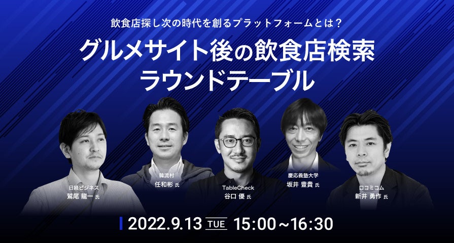 飲食店向け予約・顧客管理システムの開発・提供などを行う株式会社TableCheck(本社:東京都中央区、代表取締役社長:谷口 優、以下、テーブルチェック)は2022年9月13日(火)、報道関係者、飲食関係者の皆様に向けたセミナーイベント「グルメサイト後の飲食店検索プラットフォームラウンドテーブル」を開催いたします。ご参加のほどお願い申し上げます。