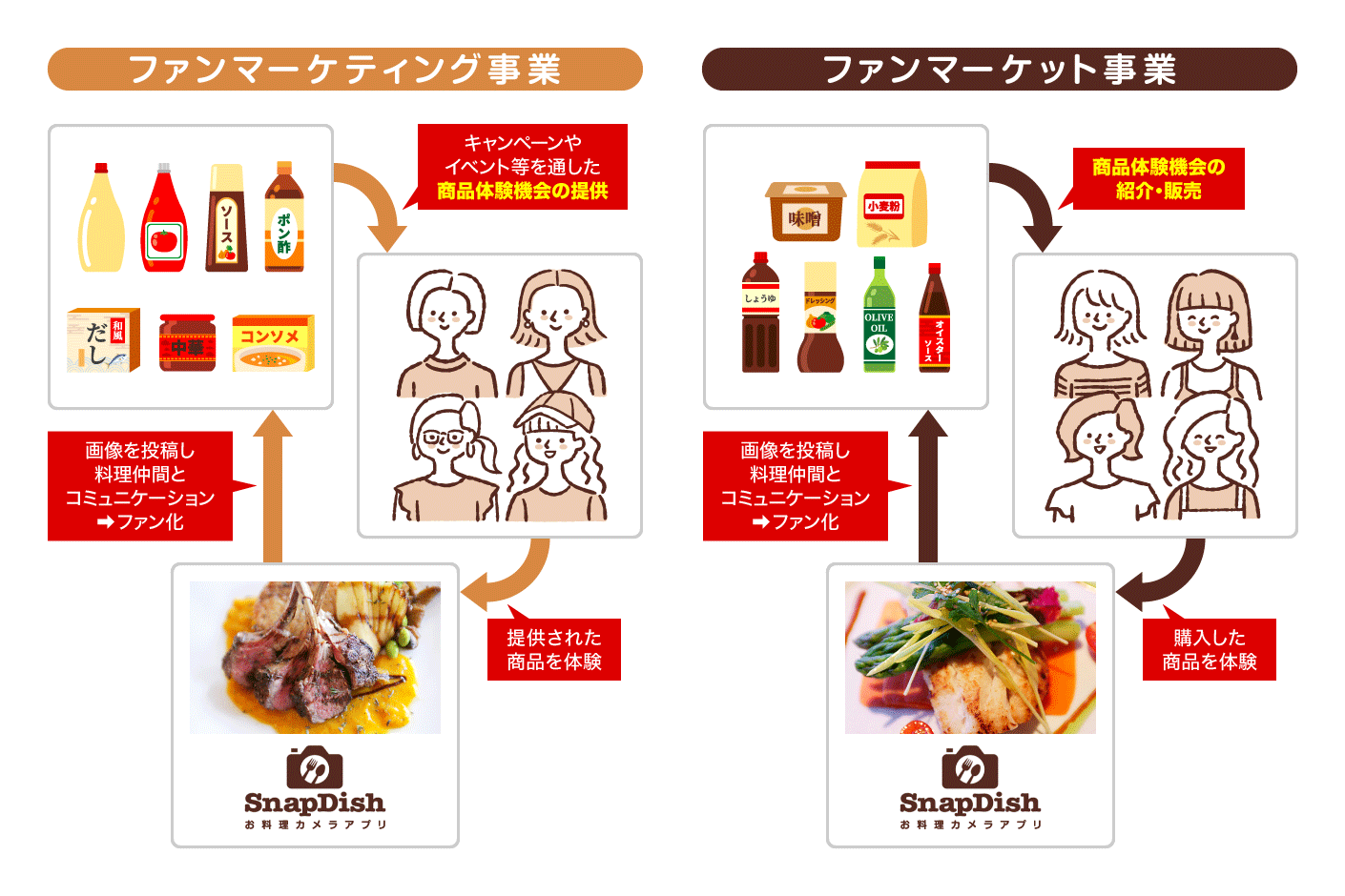 家庭で日々料理をするユーザーが料理画像を投稿し、ユーザー同士が活発なコミュニケーションを行う「スナップディッシュ」は、普段は見ることの出来ない家庭どうしの食卓と食卓がつながる場となっているため、「食卓エンゲージメントプラットフォーム」として、食品・飲料メーカーが自社商品を消費者に体験してもらい、商品やブランドの「ファン化」を促進する「ファンマーケティング事業」に活用されています。