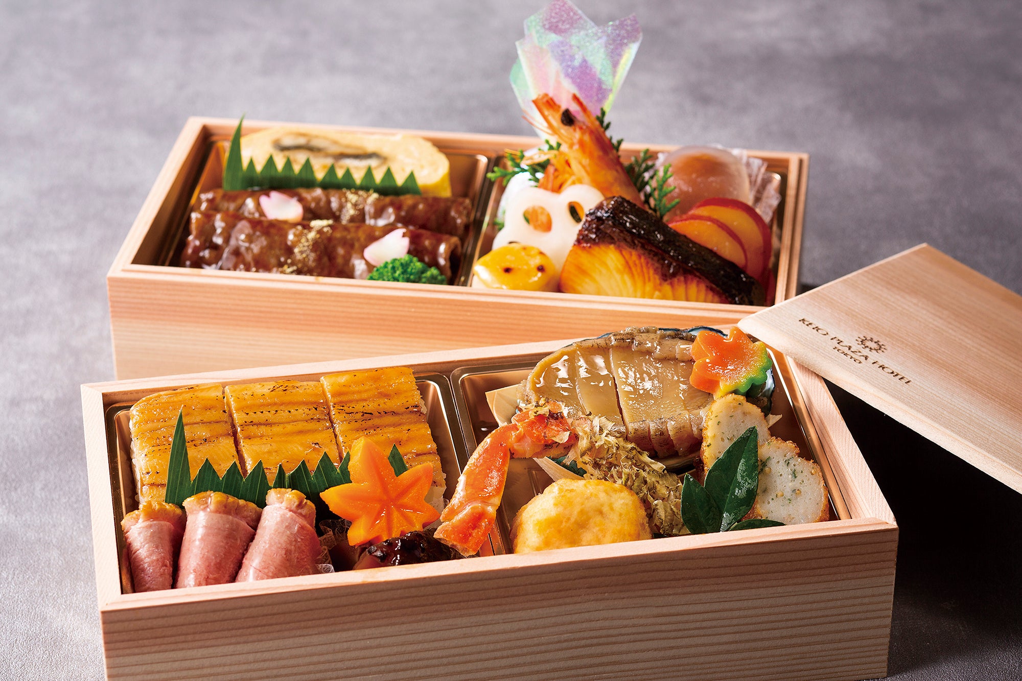 和食料理長が人気メニューである蝦夷あわび、四万十うなぎ、黒毛和牛はアレンジを加えながらもベースはそのままに、新たに近江鴨や煮穴子などを加え、腕によりをかけ二段重に仕立てました。肉質が柔らかい近江鴨はじっくりと時間をかけて火を入れることでしっとりした食感に仕上げ、しいたけの戻し汁とともに甘辛く煮たどんこ煮〆を添えております。また今回初めてデザートを取り入れ、すっきりとした味わいが特徴のシェフパティシエこだわりのベイクドチーズケーキをご用意いたしました。重箱は、料理長自ら選んだ抗菌性があると言われる香り高い秋田杉のお重を使用しております。