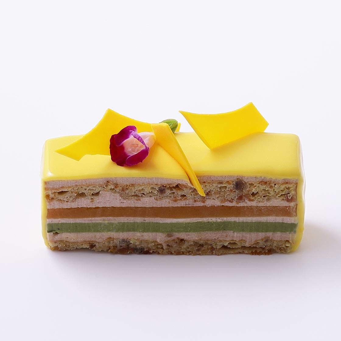 パッションフルーツのジュレと抹茶やマロンのクリームを重ねて。