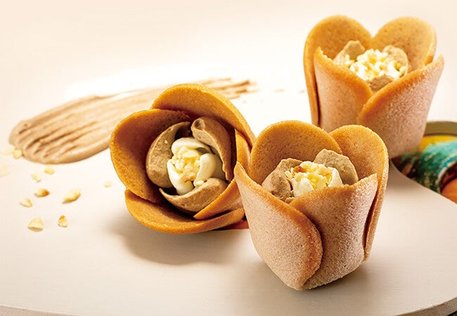 イタリア産マロンパウダーを練り込み香ばしく焼き上げたチューリップラングドシャの中に、マロンの香り豊かなショコラクリーム咲かせました。