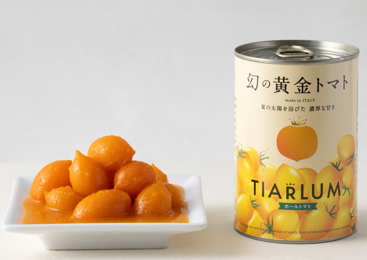 南イタリアで栽培された黄金色の小粒トマトを使ったトマト缶「TIARLUM(ティアラム)」。