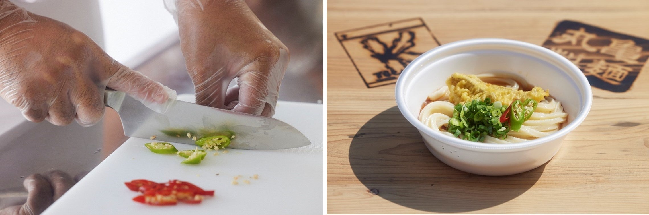手づくりの竿での釣り体験の後には、島民の皆さまを元気にするためにキッチンカー内で調理を開始。丸亀製麺唯一の麺の匠 麺匠・藤本と丸亀市との「地域活性化包括連携協定」に深くかかわる株式会社トリドールホールディングスサステナビリティ推進部長・大下と共にメニューを考え、出来上がったのは、水できゅっと締めた『ぶっかけうどん』に、讃岐広島近海でとれた鮮魚の天ぷらと、唐﨑さんの育てる「香川本鷹」、丸亀市産の「青ねぎ」を薬味に添えた『にこまる 島うどん』。