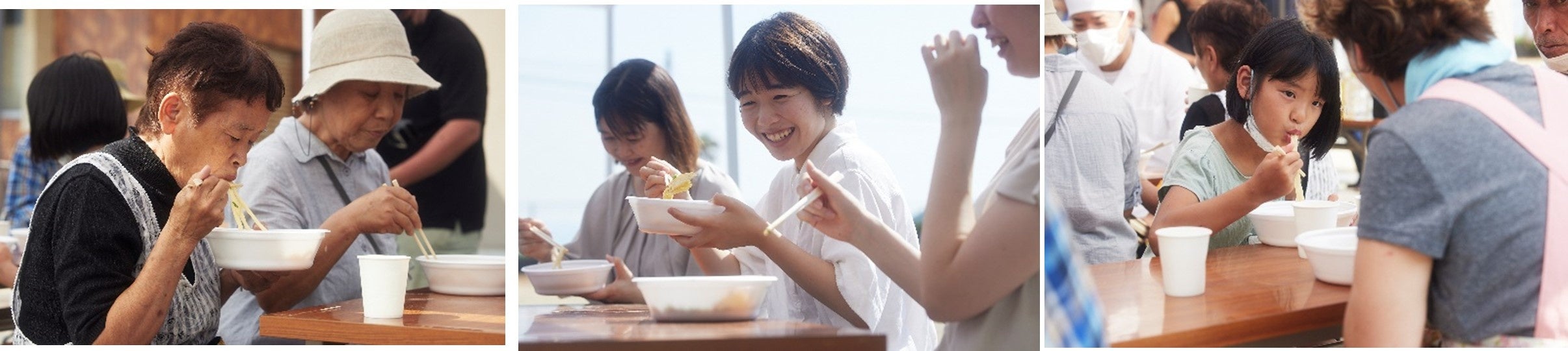 『にこまる 島うどん』を食べた島民の方々からは「香川本鷹が甘くてびっくり!さっぱりした味わいがこの季節にぴったり」「麺のコシがしっかりしていて食べ応えがある」「天ぷらも揚げたてでさくさくでおいしい」等の声があがりました。地元食材を使った手づくり、できたての天ぷら・薬味と一緒に提供されるうどんを通して、島民の皆さまの表情も元気と満開の笑顔で溢れました。
