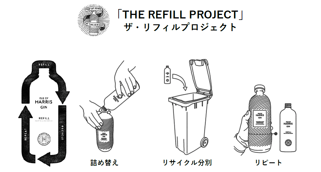 アイルオブハリス蒸溜所は、美しいハリス島や世界の自然環境を保全する持続可能な社会の維持のため、貴重なガラスボトルに詰め替えられる、軽量でリサイクル性に優れたアルミニウム製リフィールボトルをスコットランドで発売し、「THE REFILL PROJECT」を始動。