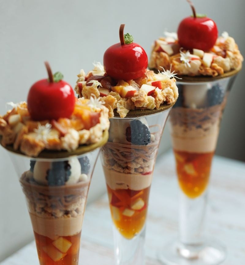アーモンドミルクを使用したムースの真っ赤なリンゴの下には、ソテーしたリンゴとフレッシュのリンゴを忍ばせて。アーモンド、アールグレイ、マロンやキャラメルなど、深まる秋を一層ごとにふんだんに感じる味わいに仕上げています。