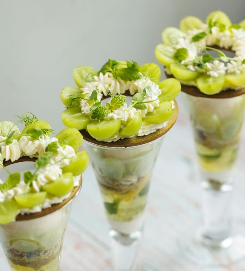 旬のシャインマスカットをふんだんに使用して再登場。米粉やラカントを使用しギルトフリーなパフェに仕上げました。花冠をイメージしたトップには、リコッタチーズクリーム、下層には白ワインのジュレを重ね、アクセントに抹茶を加えました。最後までサッパリとお楽しみください。