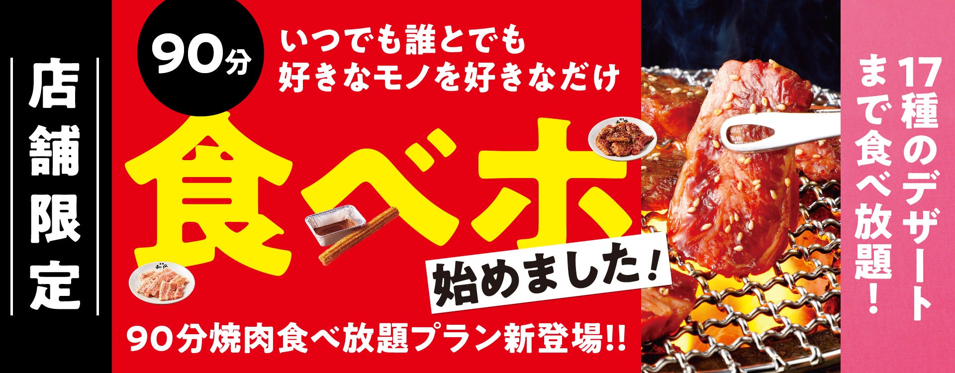 そんな中、この夏より店舗限定で販売を開始しました90分食べ放題の「食べホ」プランは、一品390円(税込429円)でご提供しているほぼすべてのグランドメニューを網羅し、かつ「デザホ」でご提供する17種のデザートまでもが対象で金額を気にせず目一杯「焼肉」を楽しみたいというお客様を中心にご好評をいただいておりますため、この度の販売店舗の追加を決定いたしました。