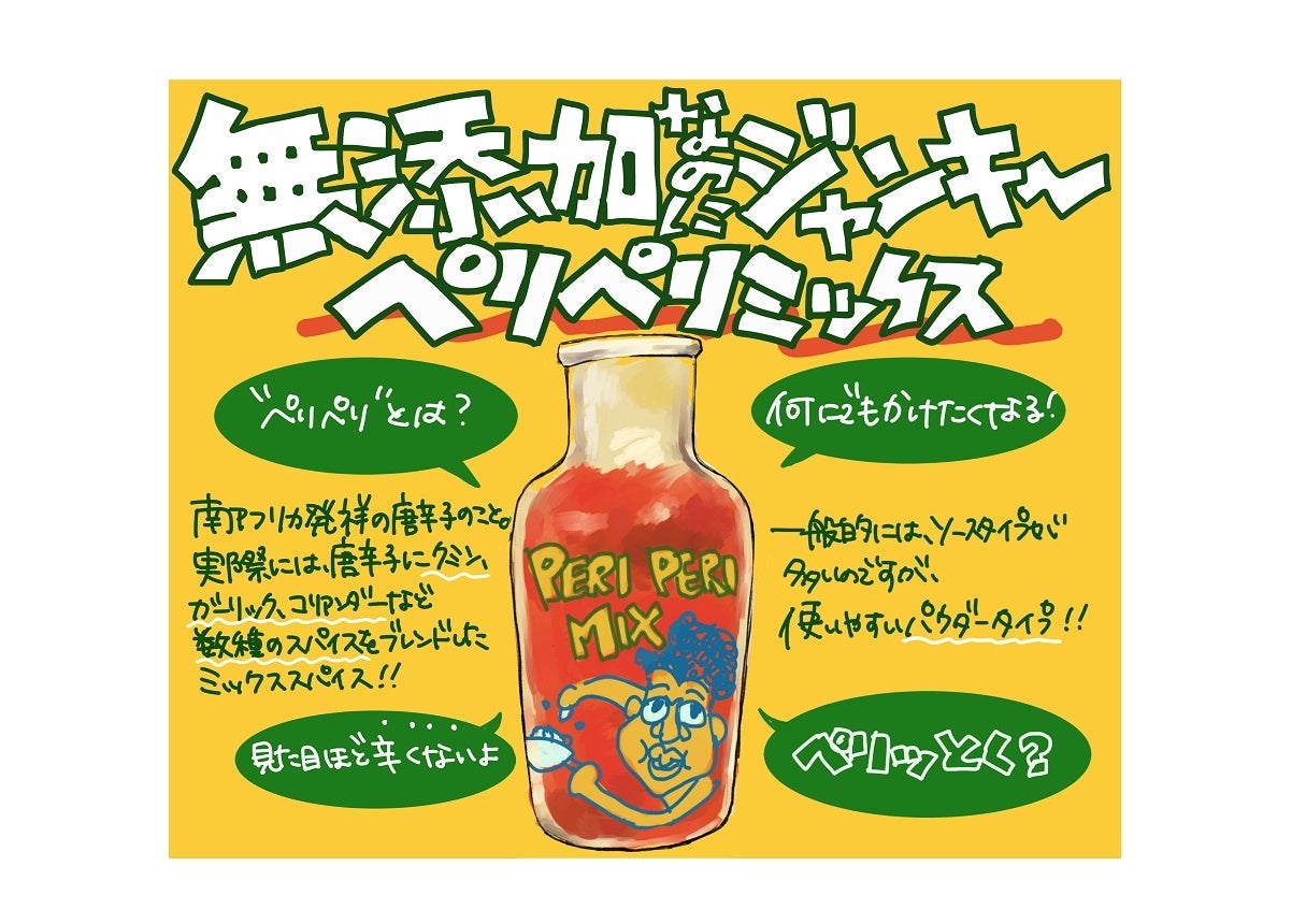 1.一般的な万能調味料に欠かせないのが添加物の旨味調味料。ペリペリミックスはジャンキーな味わいなのに無添加にこだわり消費者の罪悪感を無くし、無添加=味がうすい、美味しくないという印象を変えたい想いで開発。