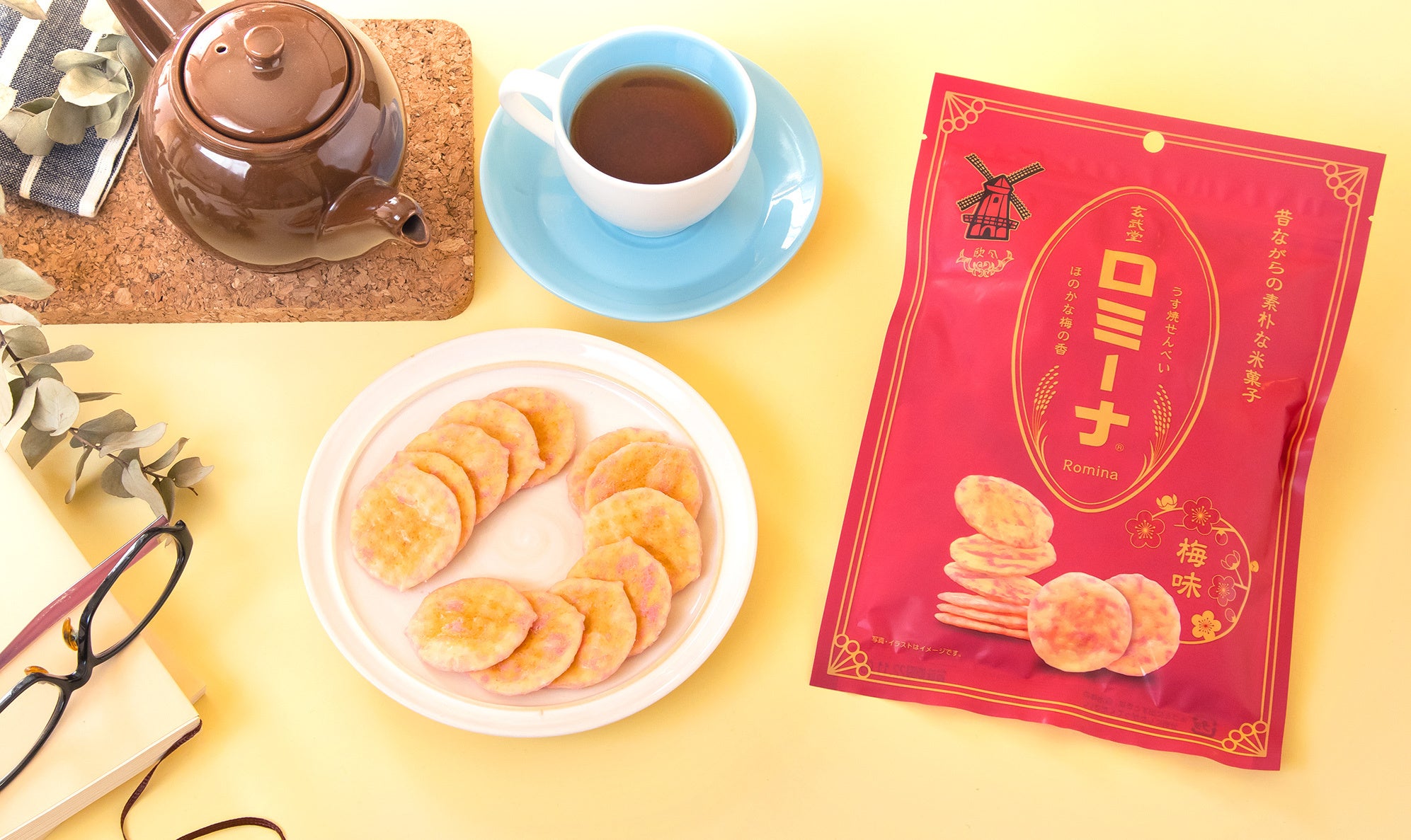 特徴:うす焼きせんべいなのにしっかりとした歯ごたえがあり、うるち米の味が楽しめます。あっさり、さっぱりとした梅味のロミーナです。