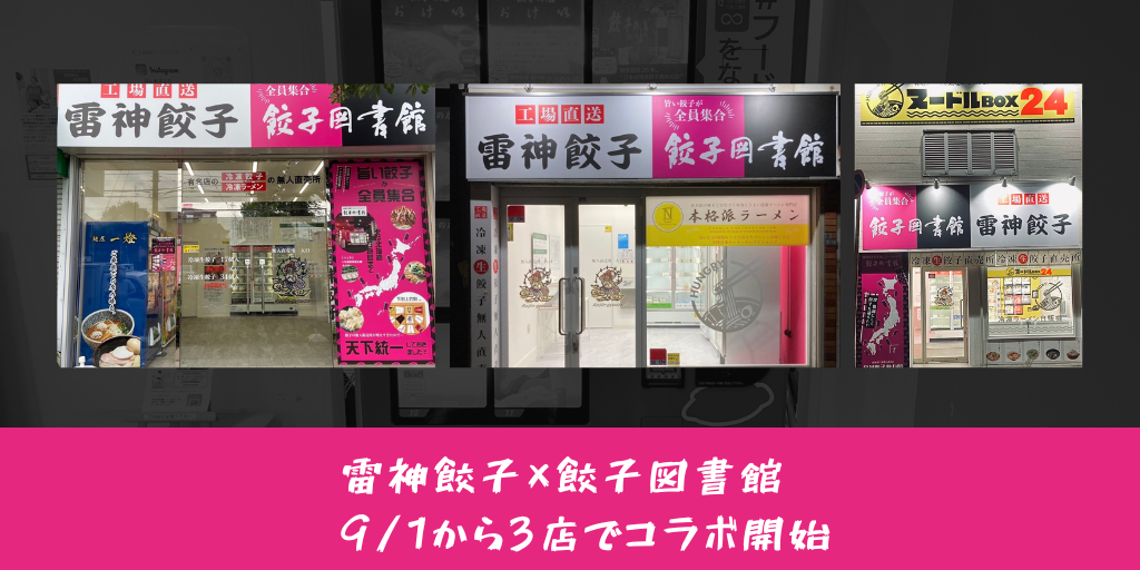 餃子・油そばなどを取り扱う無人販売所「雷神餃子」(全国で18か所)の運営ならびにヌードルツアーズをはじめとする100か所以上の冷凍自販機にて餃子を販売する株式会社雷神(本社:千葉県松戸市、代表取締役:加藤 裕之、以下:雷神)と、全国の人気餃子を集める冷凍餃子無人販売処、冷凍餃子自販機運営およびフランチャイズを主な事業とする株式会社餃子図書館(本社:東京都中央区、代表取締役CEO:三浦 大介、代表取締役COO:峯岸 純也)は、雷神餃子「千葉・市川妙典店(千葉県市川市)」「大阪・苅田店(大阪府大阪市)」「大阪・堺上店(大阪府堺市)」のまずは3店舗内に『餃子図書館』コーナーを設ける展開をはじめます。これにより、雷神餃子にご来店の皆さまには、雷神餃子の既存メニューに加え、餃子図書館が扱う全国の名店餃子を月替わりで楽しんでいただけるようになります。