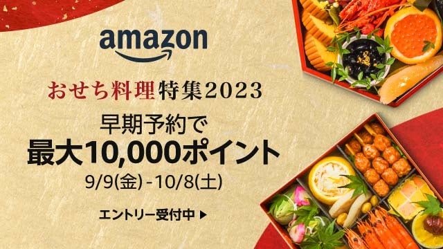 Amazonは、「おせち料理特集2023」( http://www.amazon.co.jp/osechi )をオープンし、早期予約ポイントキャンペーンを9月9日(金)より開始いたします。お客様の多様なニーズにお応えし、今年は例年好評のポイントキャンペーンにおいて3つの価格帯別に付与ポイントを設定し、5,000から最大10,000ポイントがプレゼントされます。お客様にとって2023年がより良い一年となるよう、縁起物であるおせちとともに素敵なお正月をお楽しみいただきたいと考え、様々な特色あるおせちをよりお得にご購入いただける機会をご提供いたします。