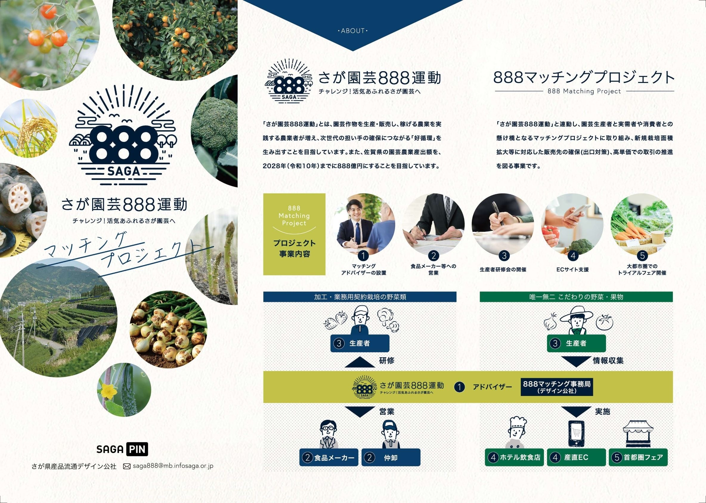888マッチングプロジェクトは、「さが園芸888運動」と連動し、園芸生産者と実需者や消費者との懸け橋となるマッチングプロジェクトに取り組み、新規栽培面積拡大等に対応した販売先の確保(出口対策)、高単価での取引の推進を図る事業です。