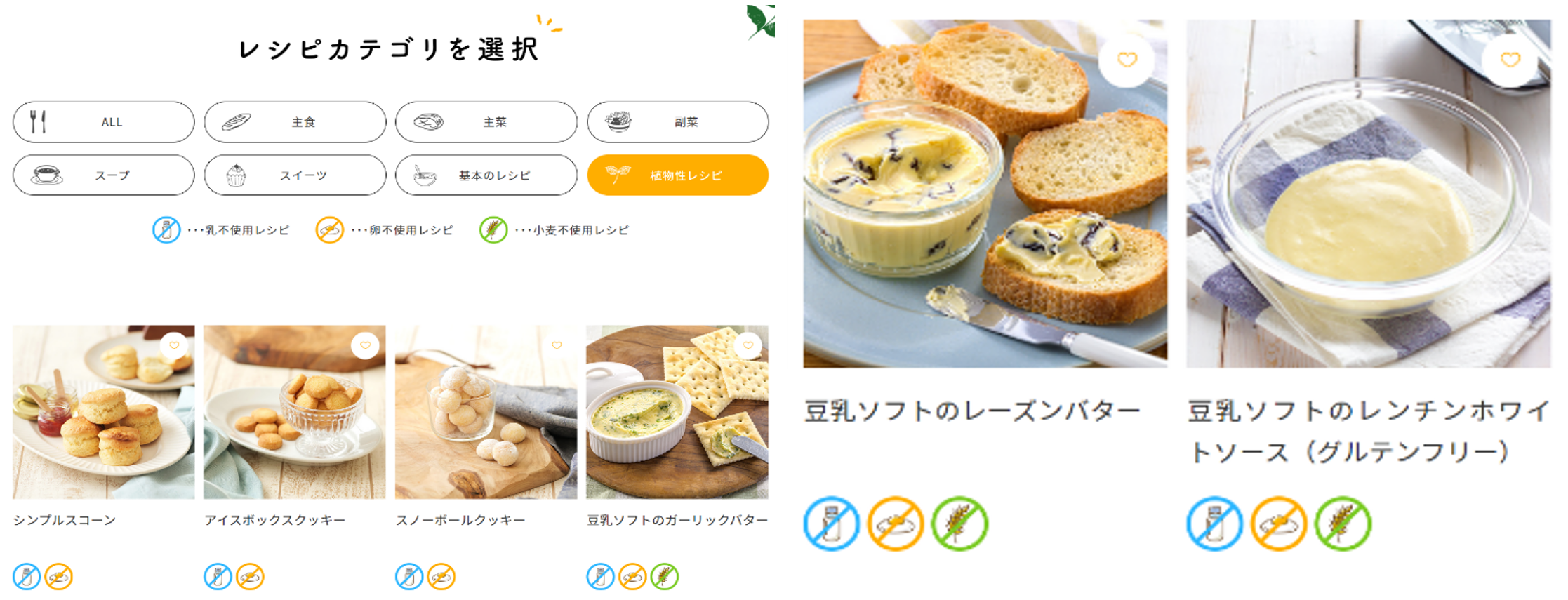 レシピページでは、乳不使用や植物性素材のみでできるメニューなど、バラエティーに富んだオリジナルレシピをご紹介しております。お料理のカテゴリーに加えて「植物性レシピ」を絞り込みタブに設置し、また3大アレルゲンの「乳」「卵」「小麦」不使用のレシピにはそれぞれのアイコンを表示することで、食物アレルギーをお持ちの方にもレシピ検索がしやすいように工夫いたしました。