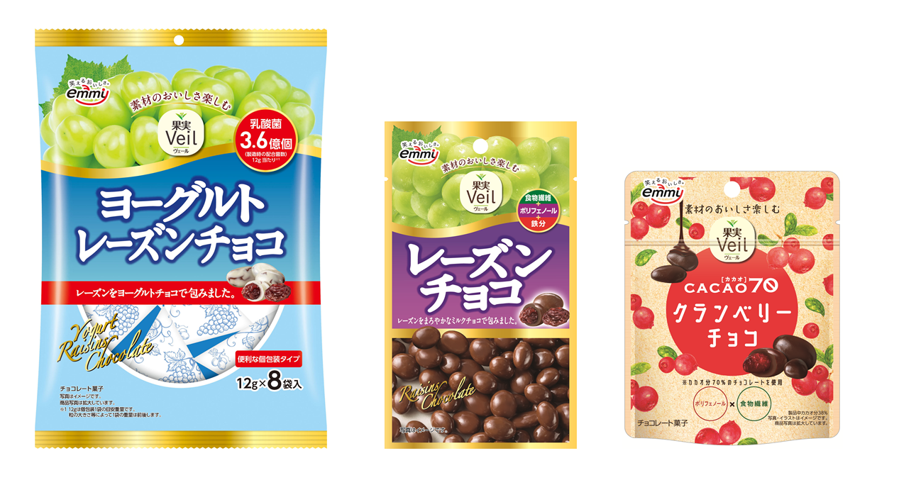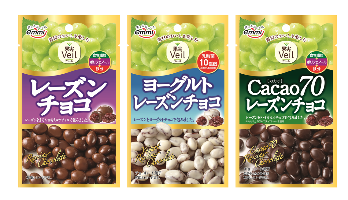 :果実Veil レーズンチョコ、ヨーグルトレーズンチョコ、カカオ70レーズンチョコ