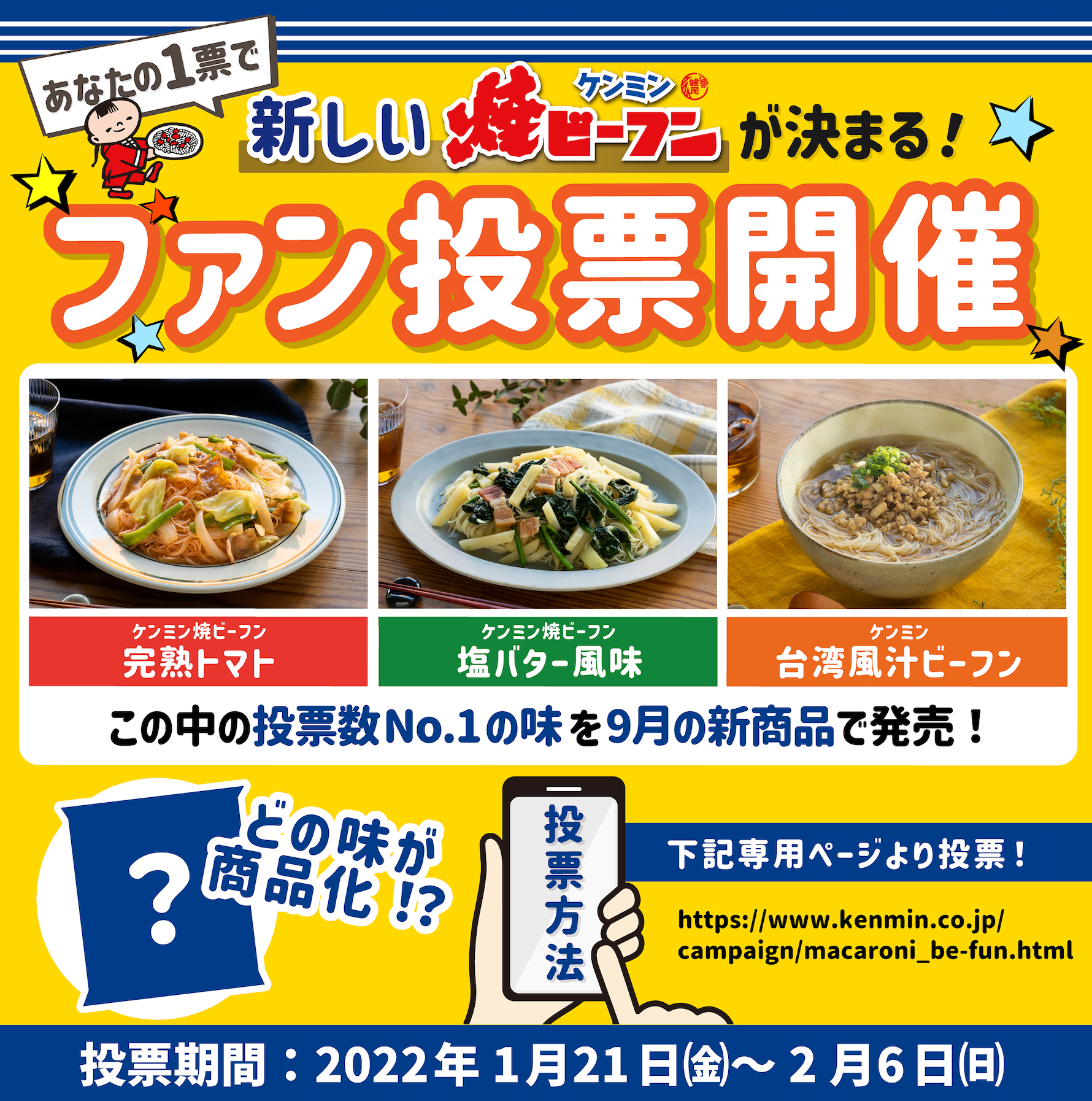 多くのお客様が抱く食生活へのリアルな要望に応える商品の開発を目的に、ケンミン食品とmacaroniが共同で「お客様の声から生まれる新しいビーフン」プロジェクトを2021年7月からスタート。これまでに、「新商品アイデア」アンケートや試食会を実施し、「ケンミン焼ビーフン完熟トマト」、 「ケンミン焼ビーフン塩バター風味」、「ケンミン台湾屋台風汁ビーフン」の新商品候補3品を開発。この中から、9月1日に発売する新商品1品を選ぶ、ファン投票を1月21日から実施しました。