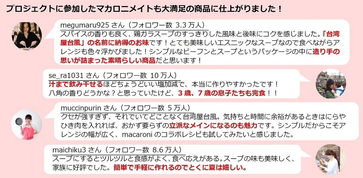 〇macaroniユーザーから集まったアイデアをもとに新商品候補3品を開発。新商品を選ぶファン投票の結果、3品の中から「台湾屋台風汁ビーフン」がNo.1に選出されました。