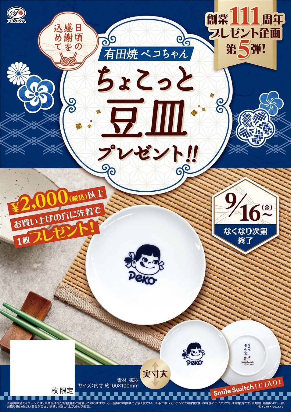 日頃の感謝を込めて、全国の不二家洋菓子店にて「有田焼ペコちゃんちょこっと豆皿」プレゼントキャンペーンを実施します。税込2,000円以上お買い上げのお客様に、先着で1枚プレゼントいたします。