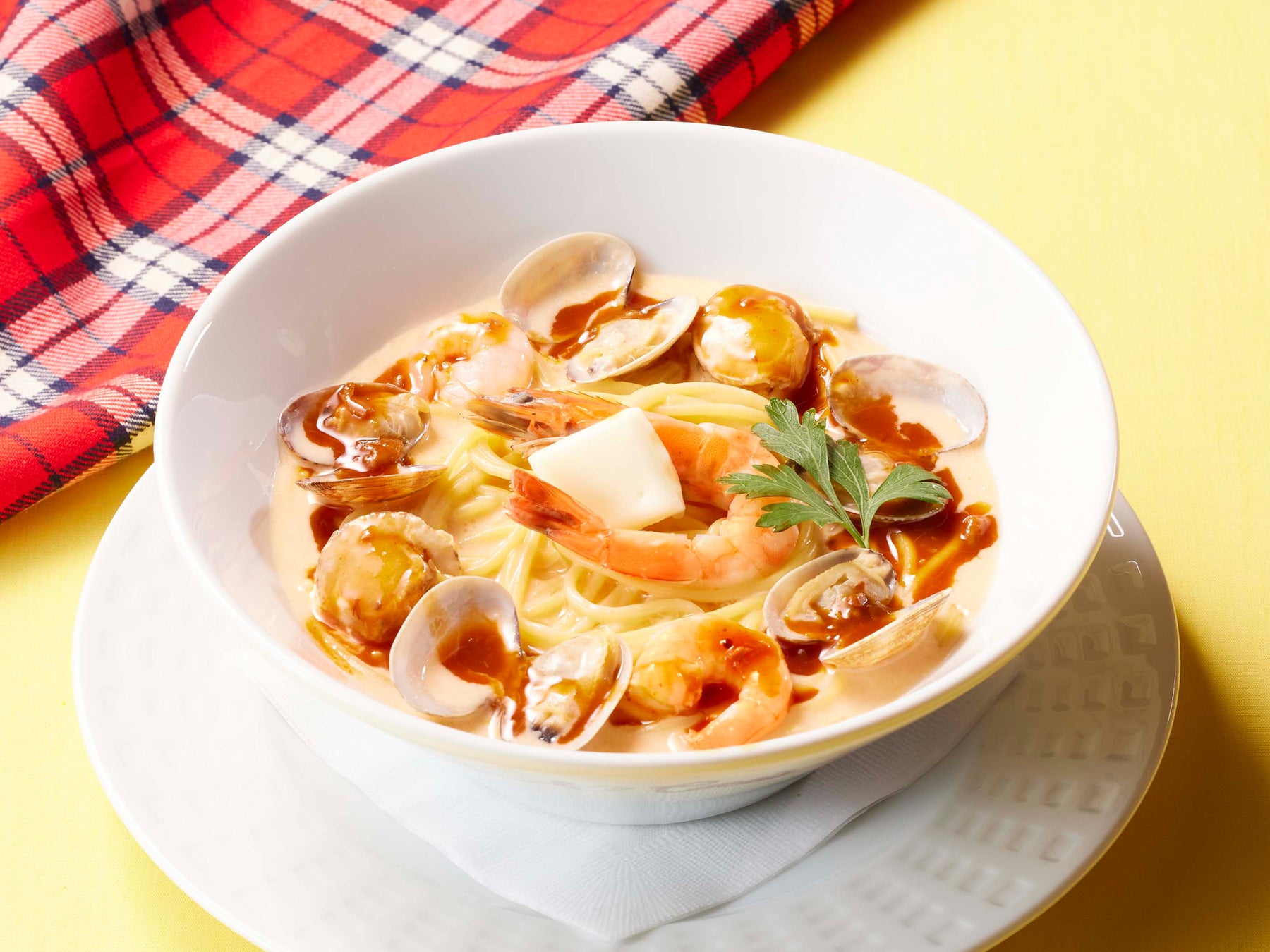 エビ、ホタテ、あさりが入った、魚介たっぷりのあったかスープパスタです。クリームソースにビスクソースを合わせることで、魚介の濃厚でまろやかな旨みをご堪能いただけます。+110円で低糖質パスタに変更可能です。