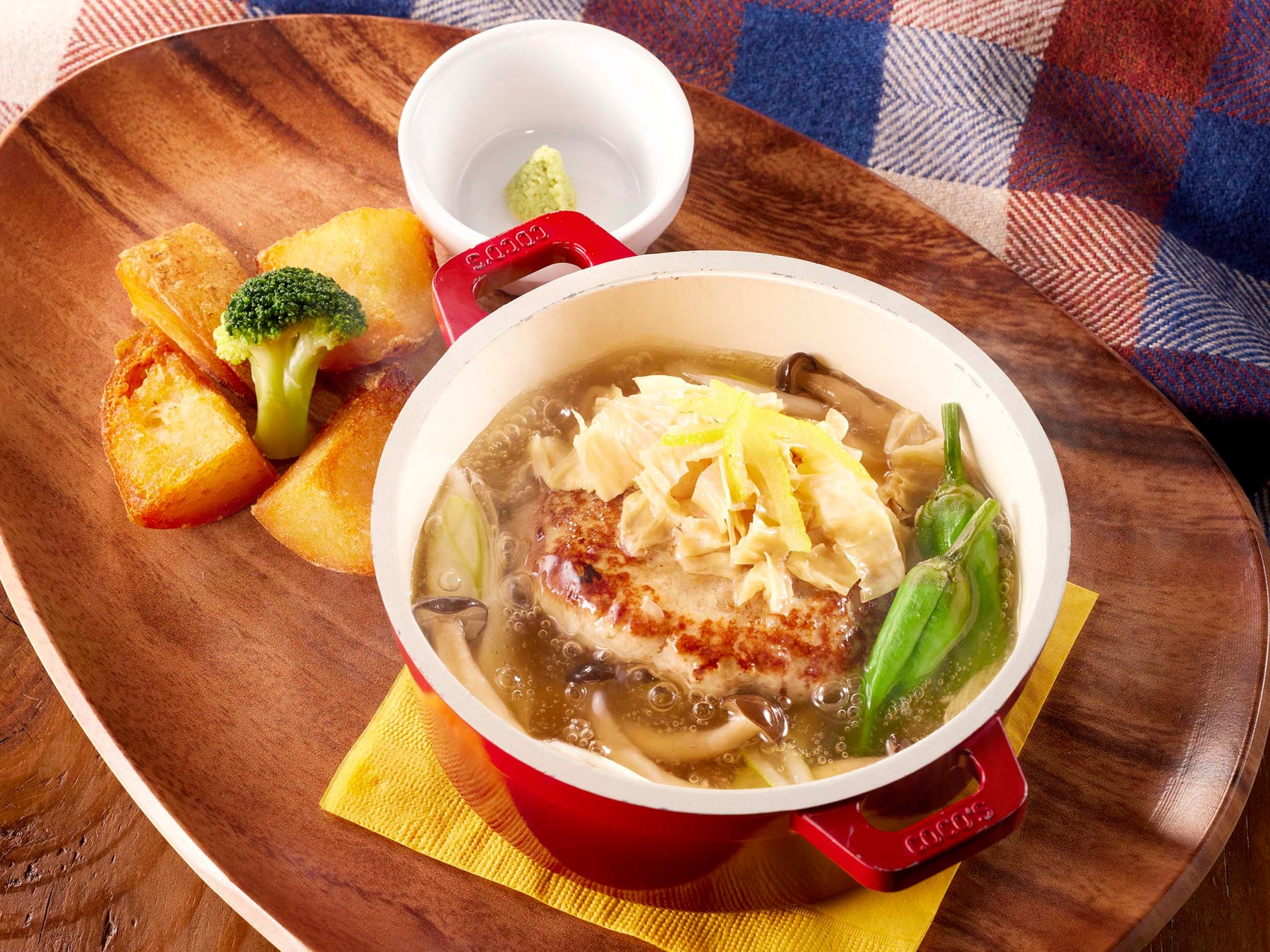 ココスの新定番「ココットハンバーグ」に新商品が登場です。柔らかいジューシーなハンバーグと国産大豆100%の湯葉を、こだわりの和風餡で包みました。しし唐のほろ苦さとゆずの豊かな香りがハンバーグの旨みを引き立てます。お好みで別添えのわさびを合わせて、優しい風味の和風餡が爽やかな香りへ変化するのをお楽しみください。