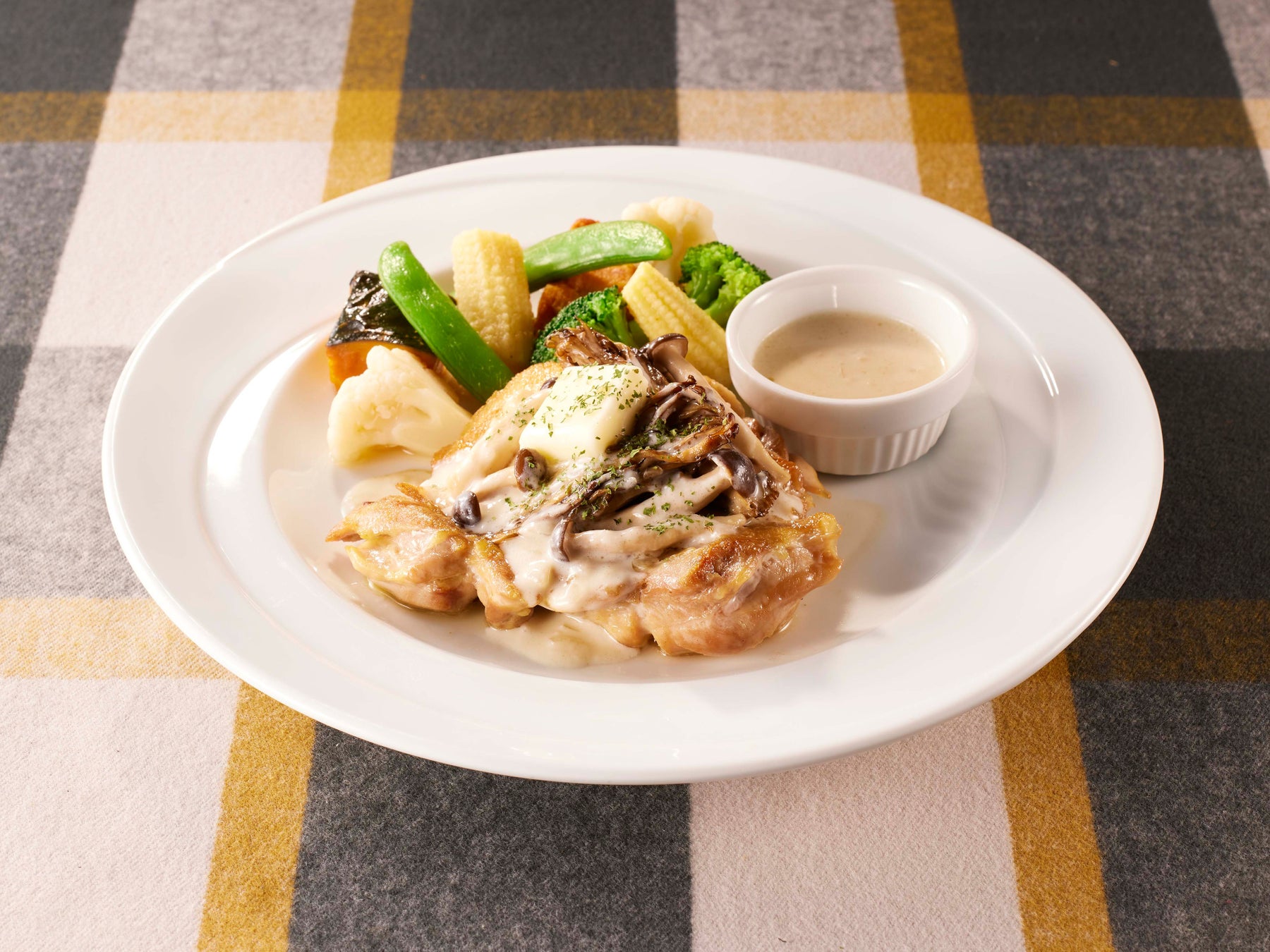 しめじと舞茸の2種類のきのこを使った季節の一品です。ジューシーに焼いた鶏もも肉に、ポルチーニ香るクリームソースと一緒に温めたしめじと舞茸、さらに、バターをのせ、コク深い味わいに仕上げました。別添えのポルチーニ香るクリームソースをかけると、より一層濃厚な旨みをお楽しみいただけます。かぼちゃなどのたっぷり温野菜と一緒にお召し上がりください。