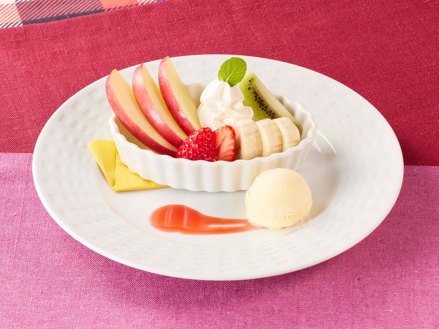 季節のフルーツをシンプルに味わう、食後にぴったりなサイズのスイーツです。約3か月おきに変更する季節のフルーツと、リンゴ、キウイ、バナナに、濃厚なバニラアイスを添えました。