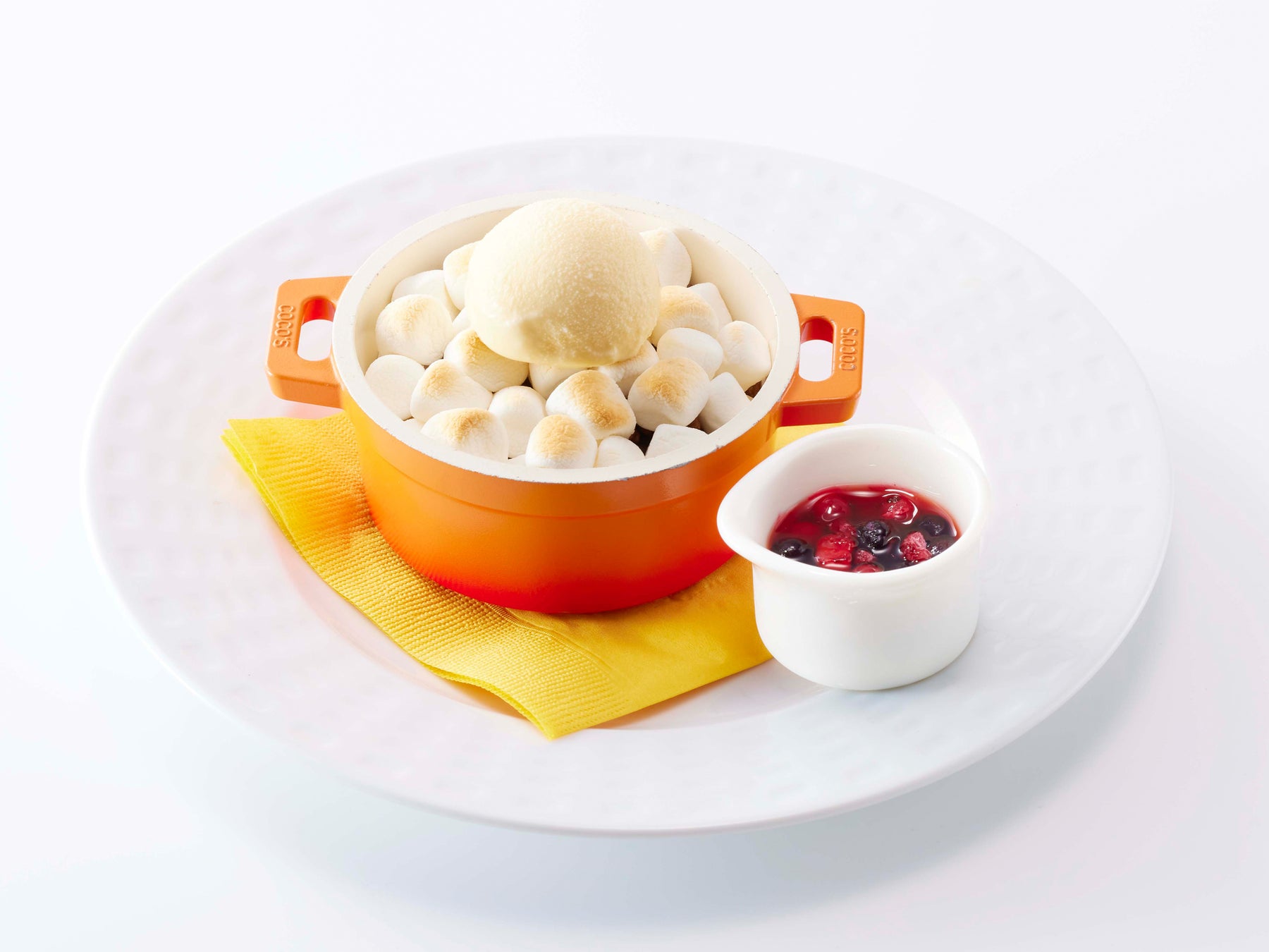 濃厚なガトーショコラの上にマシュマロを敷き詰め、オーブンで焼き上げたココスの定番スイーツです。秋冬バージョンは、ガトーショコラに加え、バナナを入れました。ひんやり冷たいバニラアイスと温かいショコラが絡む“ひやあつ”商品です。お好みで、甘酸っぱいミックスベリーソースをかけて、味の変化をお楽しみください。