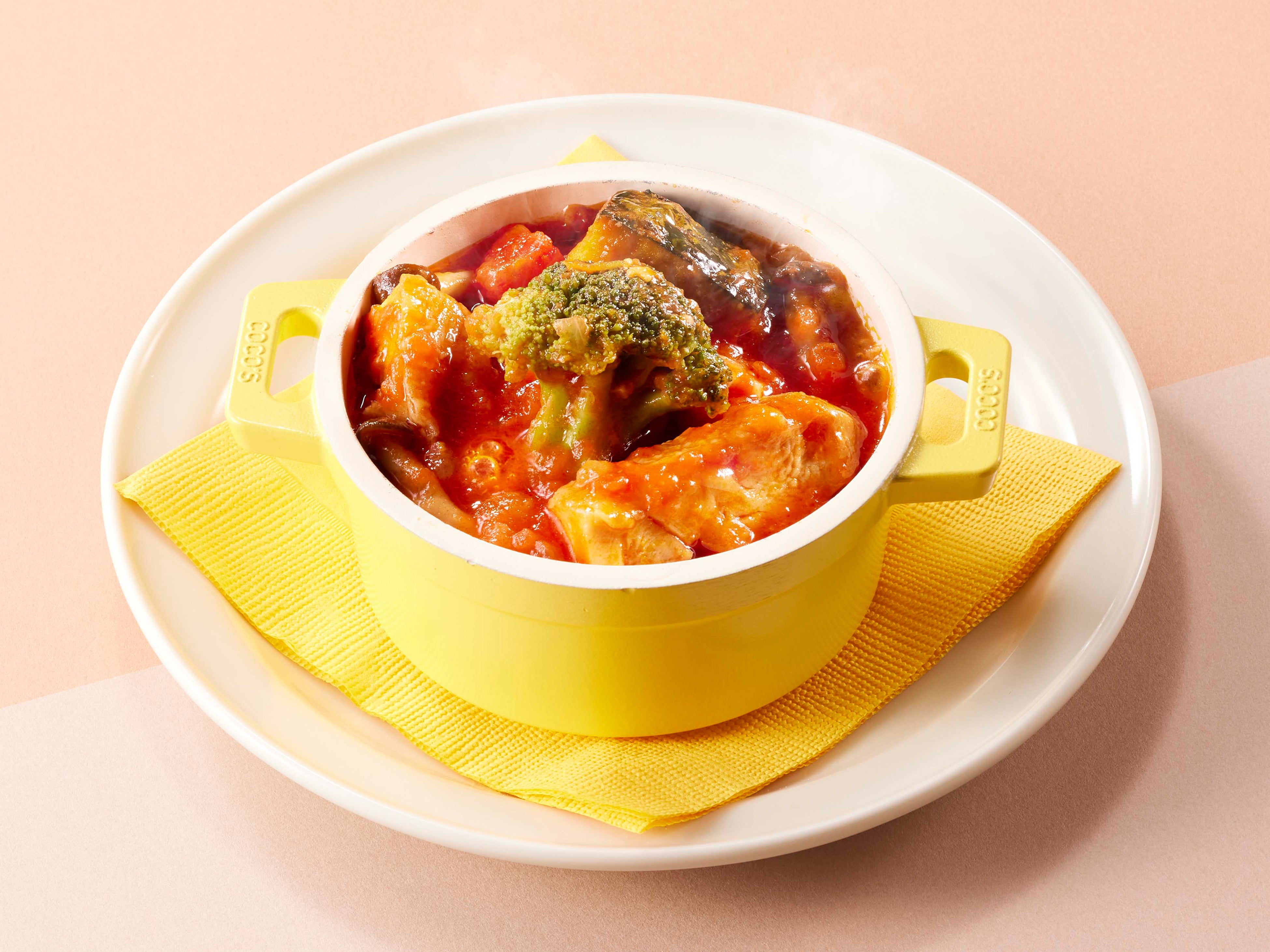 鶏もも肉とブロッコリー、かぼちゃ、しめじがゴロゴロ入った具材たっぷりのアペタイザーです。特長の異なる2種類のトマトソースを混ぜ合わせたソースは、旨みと酸味が絶妙な味わいで、フライドガーリックが香ばしさをプラスします。唐辛子の辛味がアクセントとなり、肌寒くなる季節にぴったりな一品です。