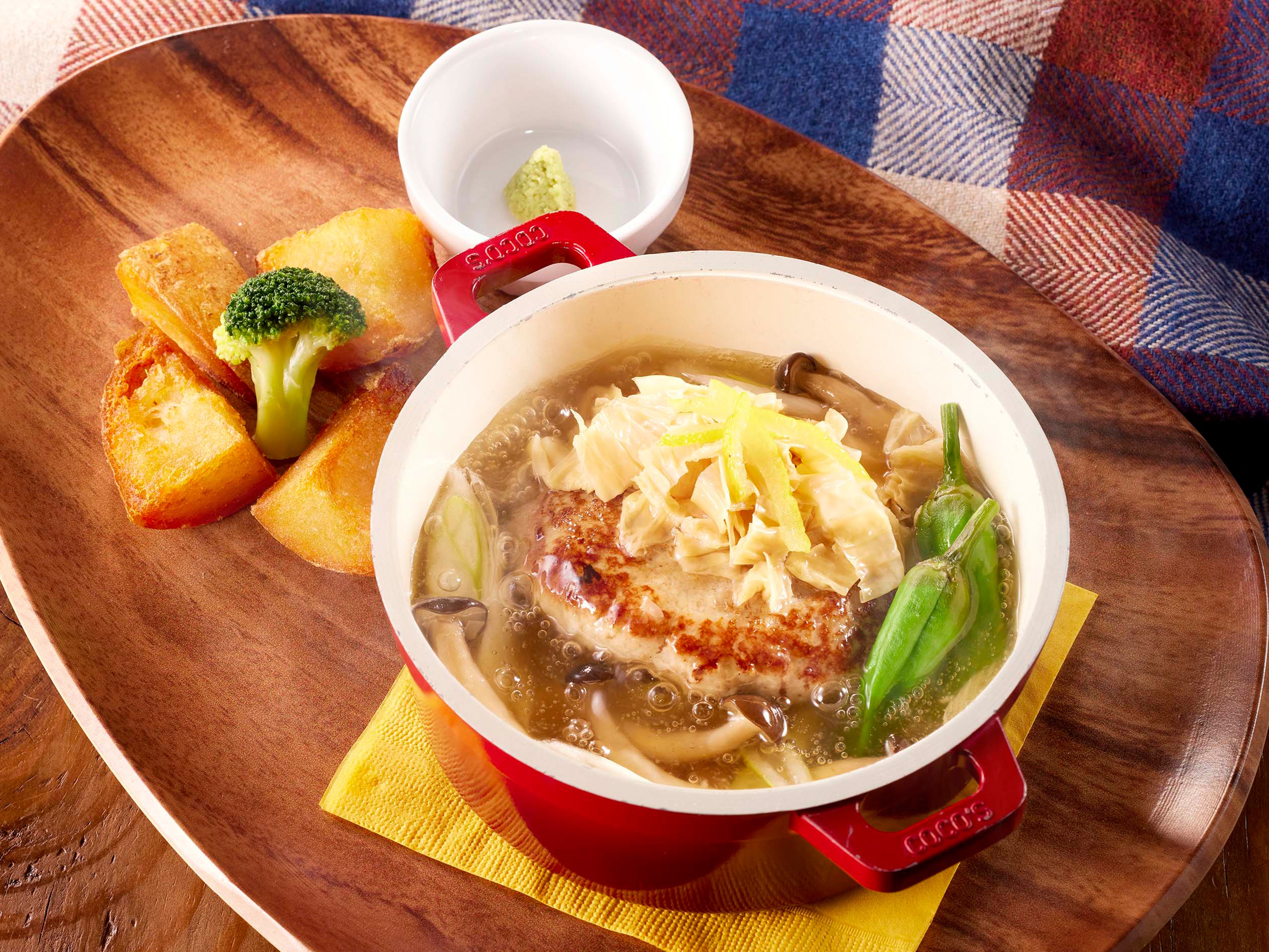 ココスの新定番「ココットハンバーグ」に新商品が登場です。柔らかいジューシーなハンバーグと国産大豆100%の湯葉を、こだわりの和風餡で包みました。しし唐のほろ苦さとゆずの豊かな香りがハンバーグの旨みを引き立てます。お好みで別添えのわさびを合わせて、優しい風味の和風餡が爽やかな香りへ変化するのをお楽しみください。
