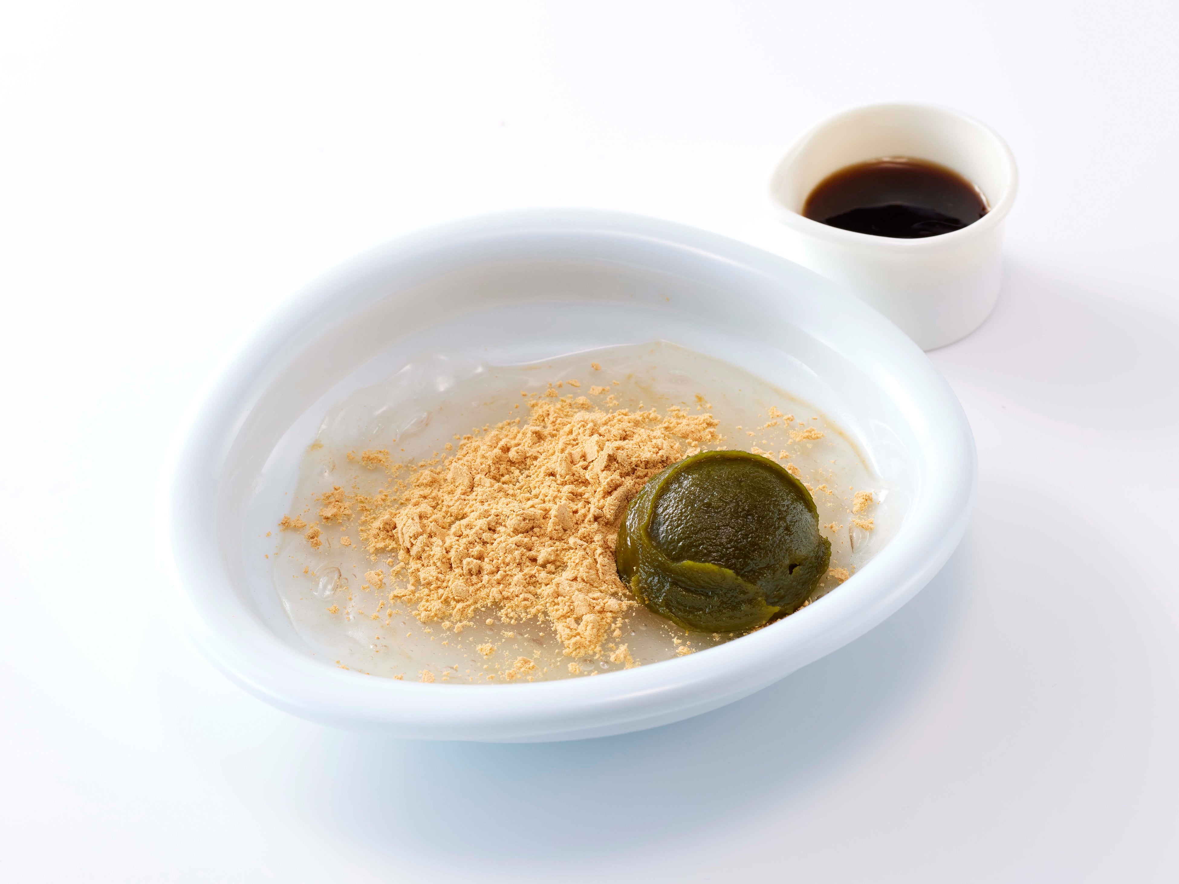 わらびもちに抹茶餡を添えた秋冬らしい温かい商品です。もちもちのび~るわらびもちに、香ばしいきなこをかけ、濃厚な甘みの中にほんのり抹茶の渋みを感じる抹茶餡を添えました。お好みで黒糖シロップをかけ、よりコク深い味わいをお楽しみください。