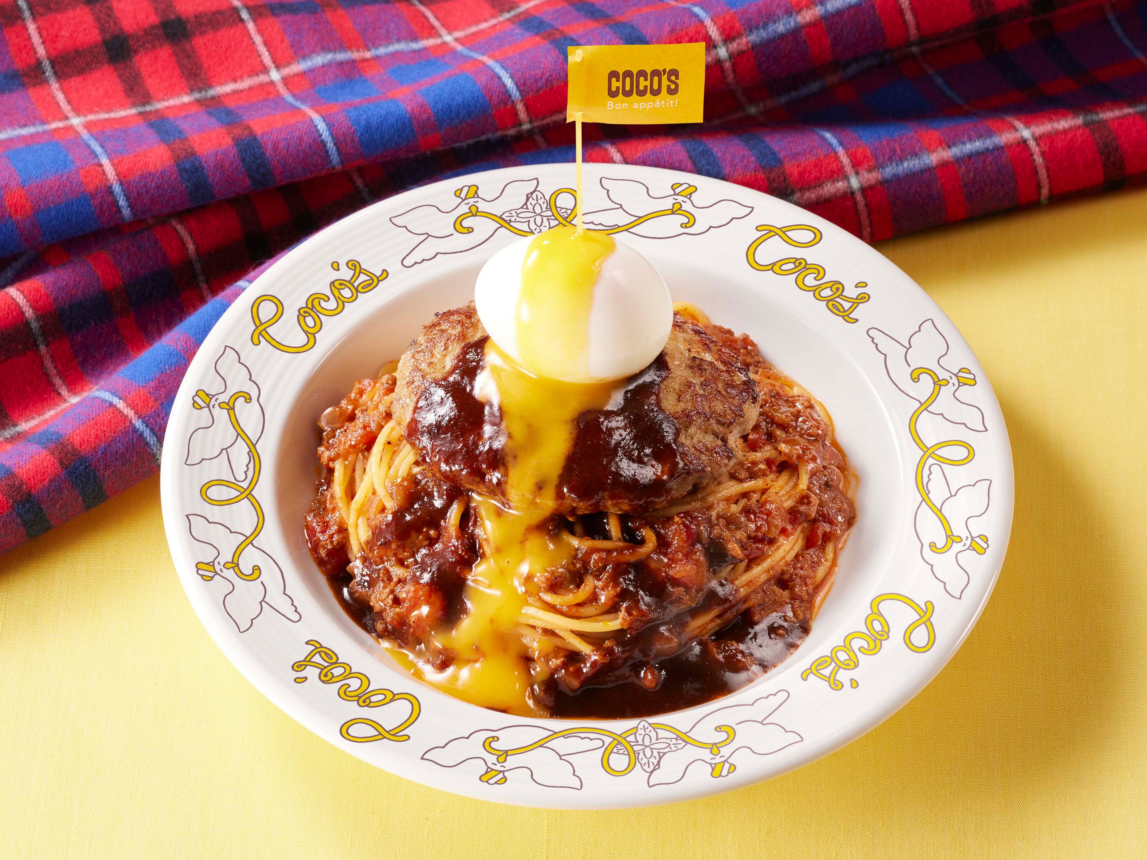 ココスの本格ハンバーグとパスタを一皿にした、まさにココスでしか味わえない逸品です。アルデンテのパスタで作ったボロネーゼとオーブンでふっくら焼き上げたハンバーグに、濃厚なデミグラスソースをかけ、さらに、ゆで卵をトッピングしました。ハンバーグとゆで卵をお好みの大きさに崩しながら、お客様自身でボロネーゼを完成させます。とろ~っとかかった濃厚なチェダーチーズソースと絡めてお楽しみください。