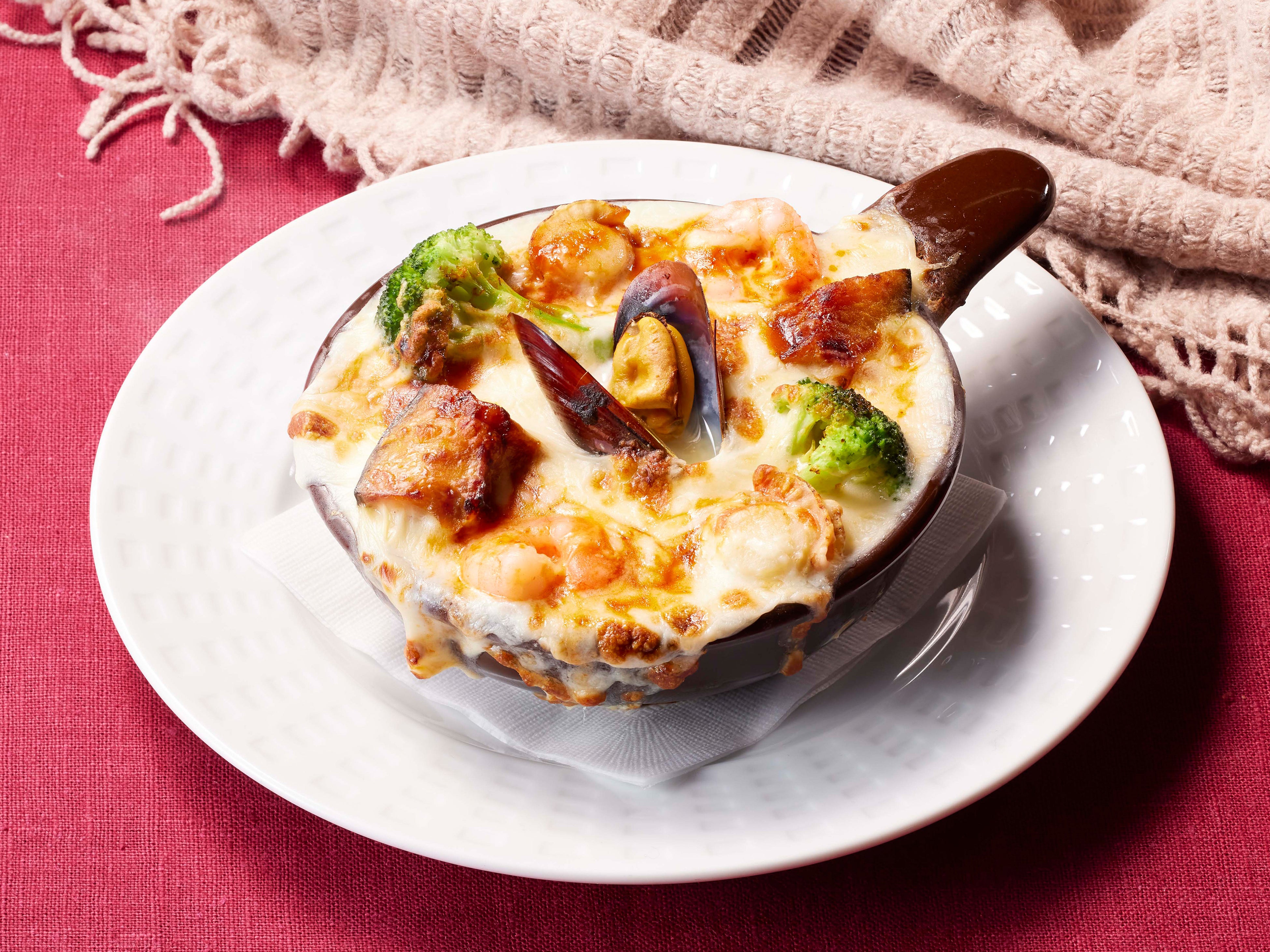 器からあふれるソースとこんがり焼けた表面が食欲をそそるクリームドリアです。エビとホタテ、ムール貝、かぼちゃ、ブロッコリーにまろやかなクリームソースを合わせ、エビの旨みが凝縮されたビスクソースをかけました。魚介や野菜の旨みと濃厚なソースで、ココスのドリアの豊かな味わいを心ゆくまでお楽しみください。