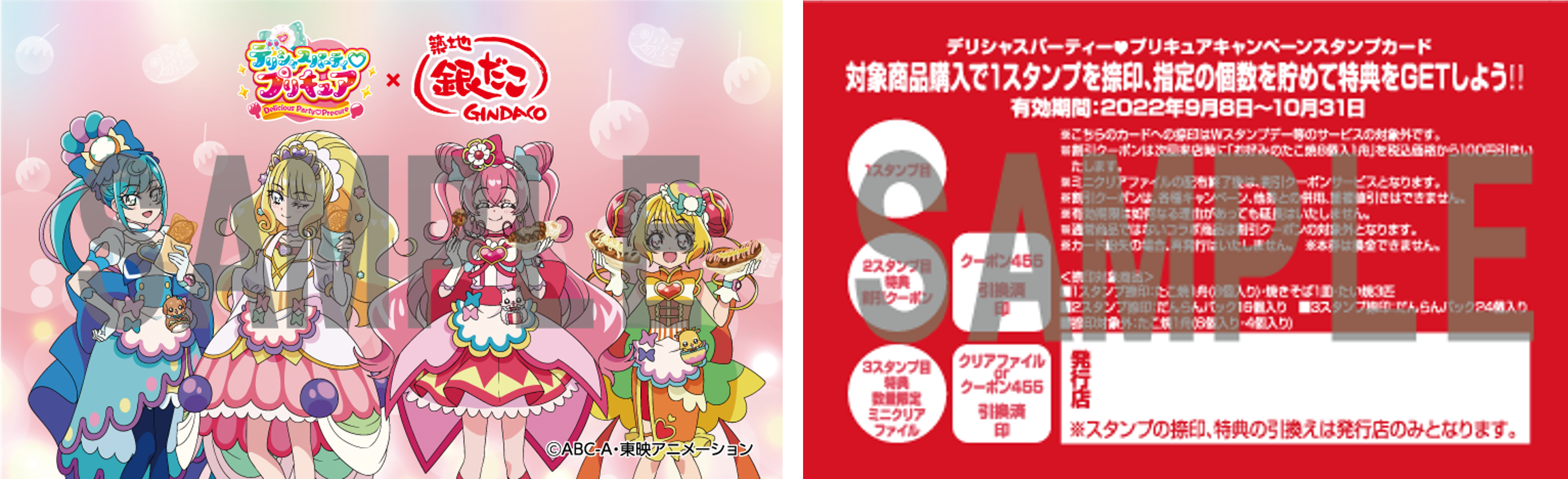 さらに、今回のコラボでは購入特典として、コラボ商品1箱につき1枚 「シールスタンプカード」 を配布いたします。 「シールスタンプカード」 は表面が描きおろしキャラクターがデザインされたノベルティの “シール” で、裏面が今回のコラボ専用の “スタンプカード” になった両面仕様です。 “スタンプカード” は、発行店舗のみ使用することができ、一定数のスタンプを貯めると、割引サービスや今回の描き下ろしがデザインされた 数量限定 「ミニクリアファイル」 をプレゼントいたします。詳細内容についてはこちら(https://www.gindaco.com/files/2209campaign_qa/)をご確認ください。