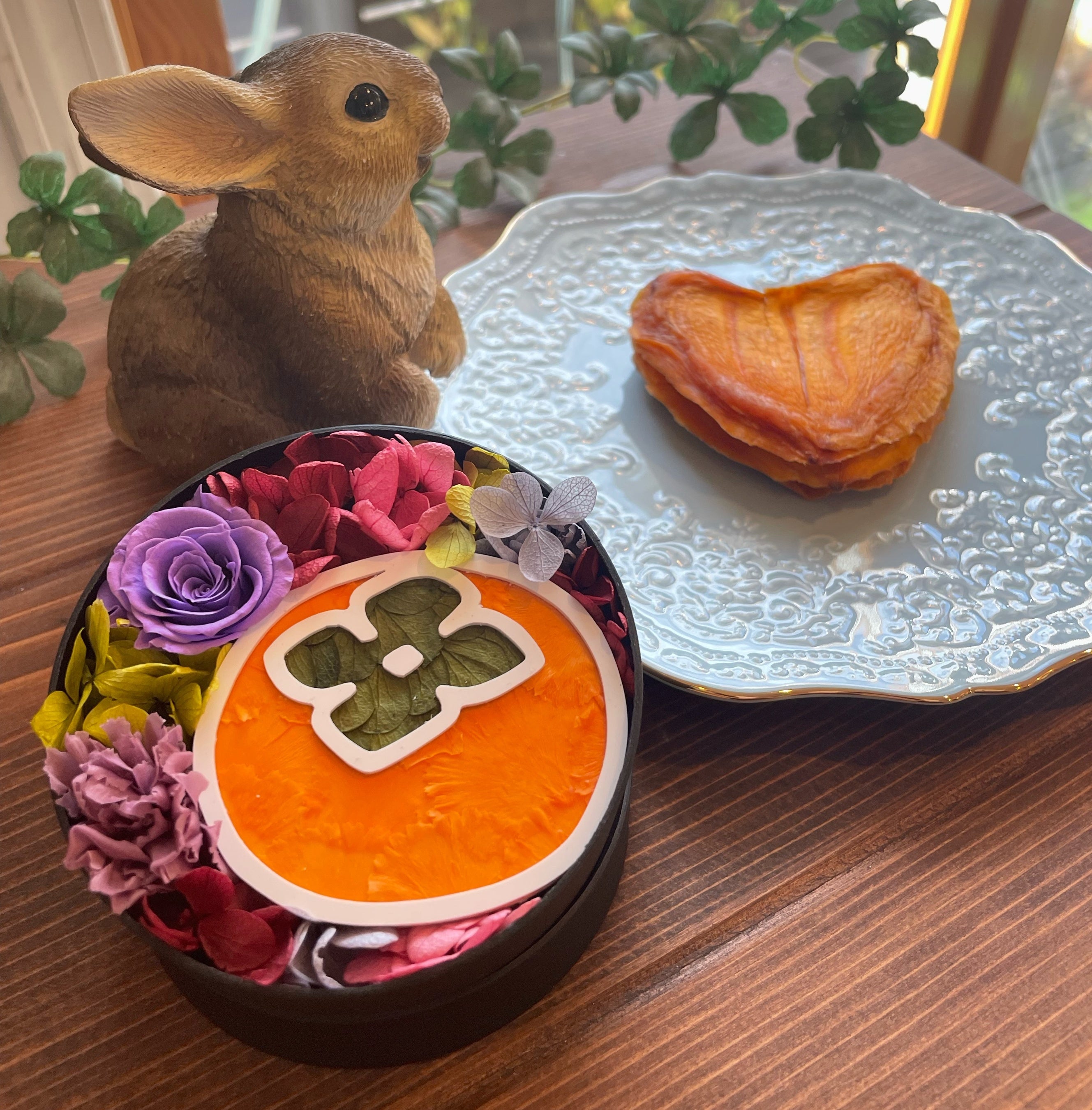 フラワーBOXは、生花を特殊加工した枯れないお花・プリザーブドフラワーを使って柿を描いたユニークな一品。柿の部分は、カーネーションの花びらを貼り絵のように一枚ずつ手作業で貼り合わせて表現しています。