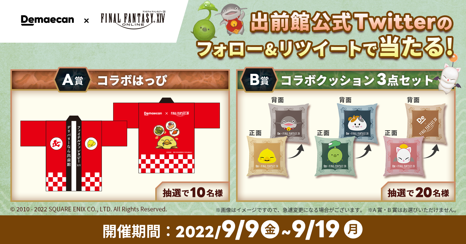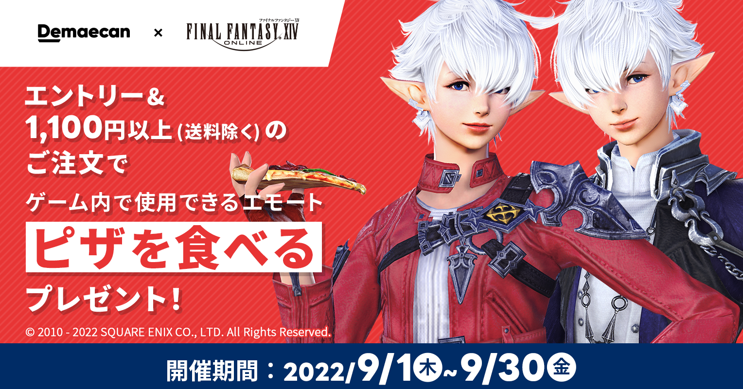 このたび『出前館』は、「ファイナルファンタジーXIV」とのエントリー&注文キャンペーンを2022年9月1日(木)より開催します。キャンペーンにエントリーし、1回の注文で1,100円以上(送料除く)注文をした方全員に、ゲーム内で使用できるエモート「ピザを食べる」をプレゼントいたします。さらに、同時に『出前館』を初めて利用する方を対象としてコラボクーポンを配布いたします。また、『出前館』の公式Twitterにて、「コラボはっぴ」や「コラボクッション3点セット」が当たるフォロー&RTキャンペーンを2022年9月9日(金)より開催します。