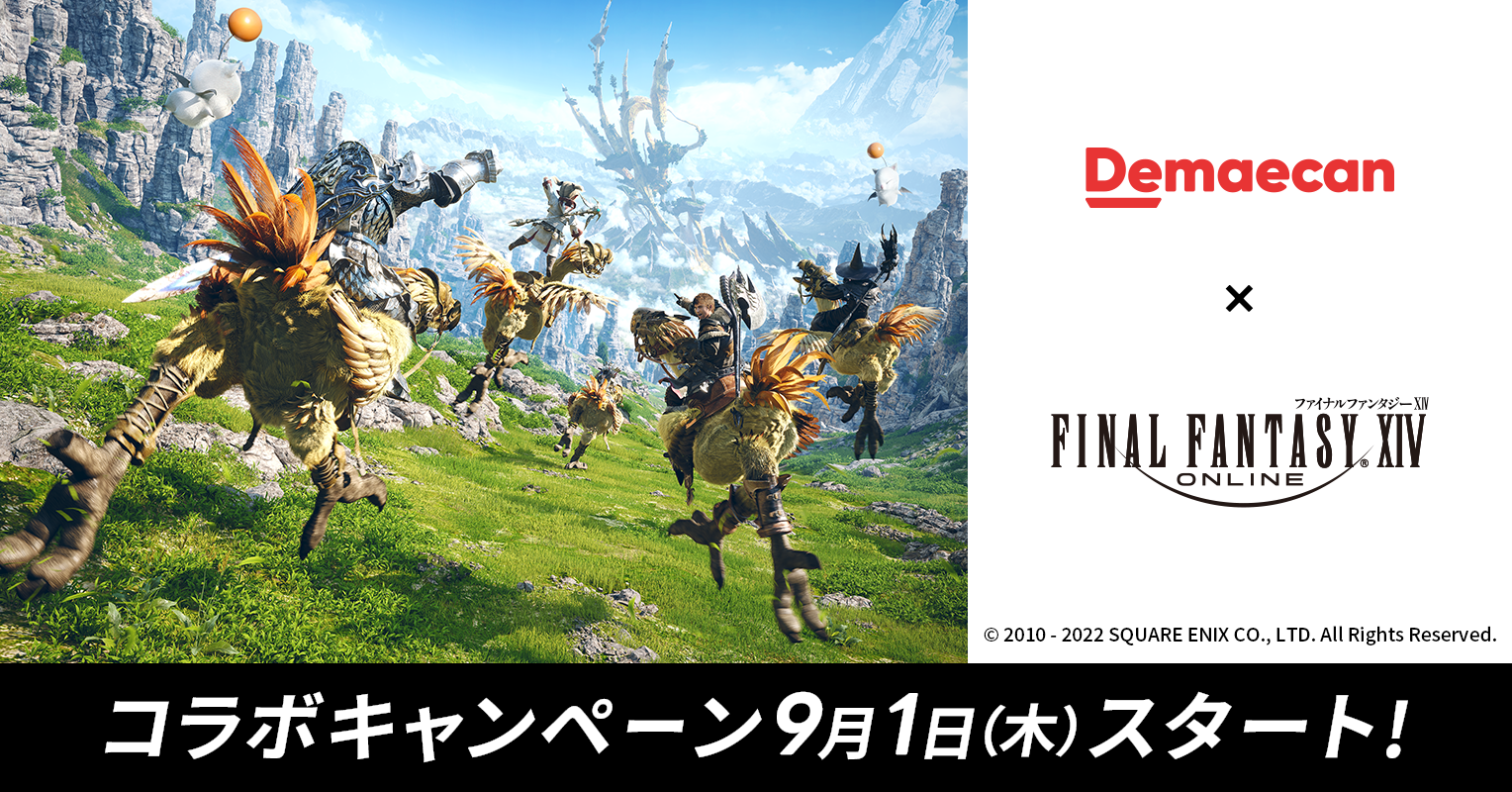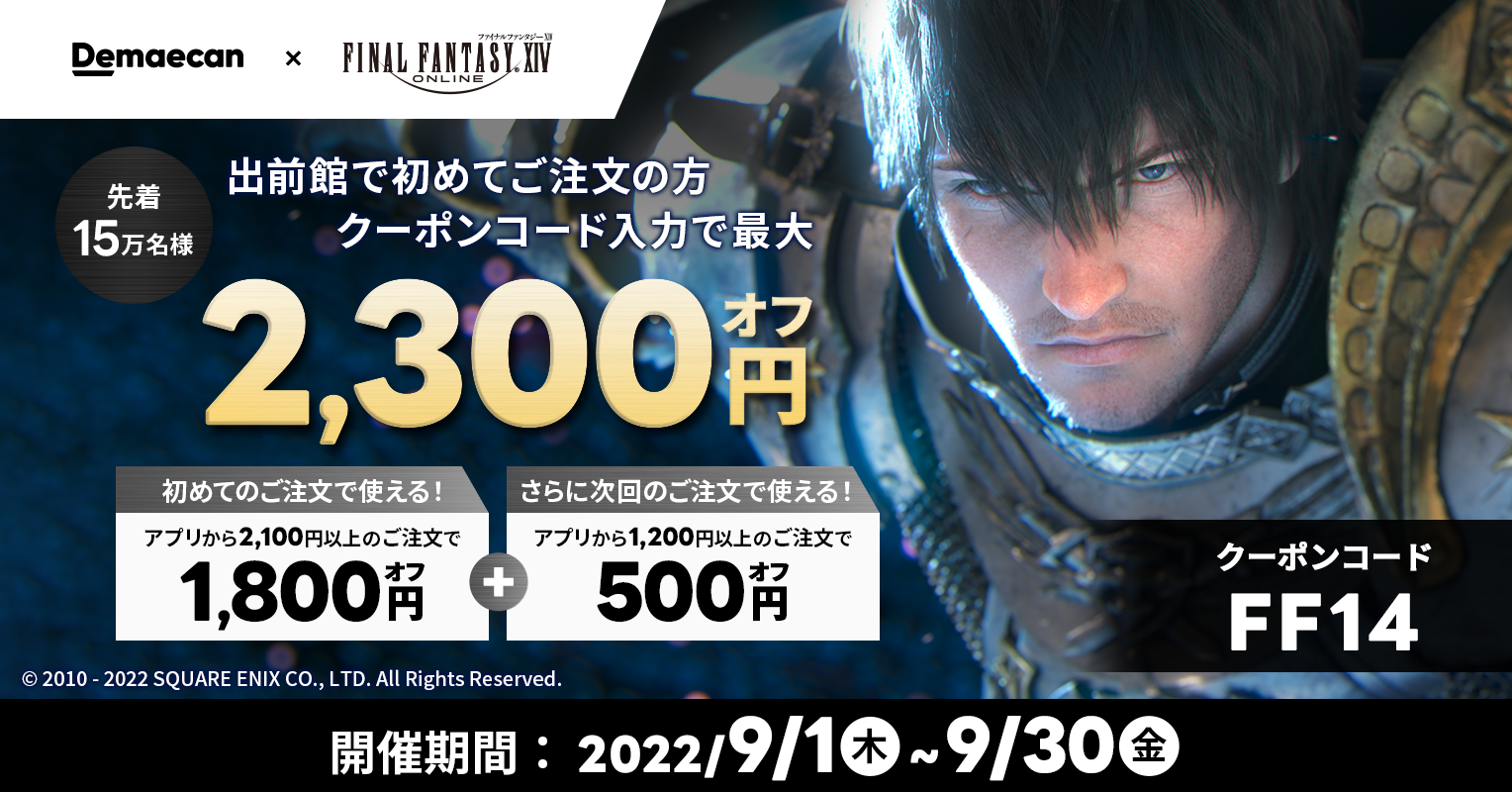 日本最大級のデリバリーサービス『出前館』(運営:株式会社出前館)は、大人気ゲーム「ファイナルファンタジーXIV」と2022年9月1日(木)よりコラボキャンペーンを開催いたします。
