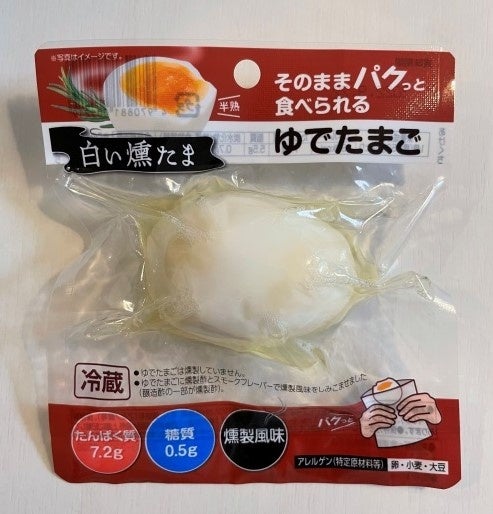 新商品の「白い燻たま」は、パッケージから出してすぐに、“そのままパクっと”食べることができる、殻がむいてある燻製風味の半熟ゆでたまごです。
