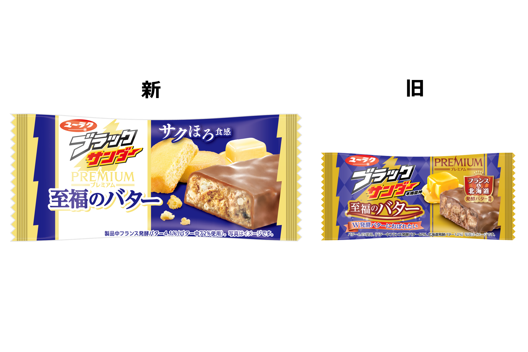 これまでご愛顧いただいていた「至福のバター」の印象はそのままに、さらにプレミアム感満載なパッケージにリニューアルしました。 プレミアム感を高めるため、深みのあるブルーと落ち着きのあるゴールドのメインカラーをベースに、新たにホワイトを取り入れました。通常のブラックサンダーと並ぶことで、ブラックサンダーシリーズとしてお客様の目を惹くよう、シリーズ全体のカラーリングも考えたデザインとなっています。