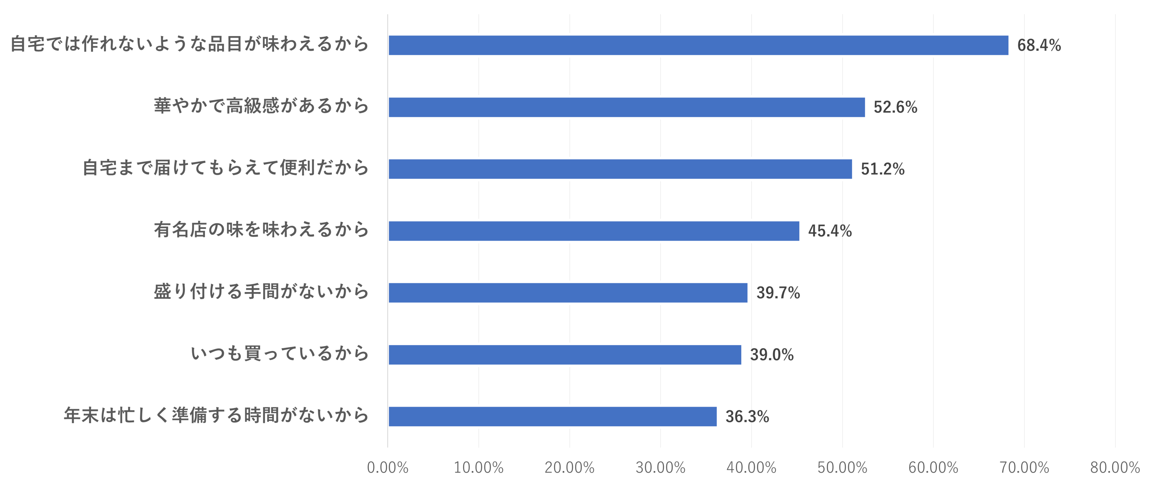 おせちの購入理由1位は「自宅でつくれないような品目が味わえる」(68.4%)。次いで「華やかで高級感がある」(52.6%)、「自宅まで届けてもらえて便利」(51.2%)といった理由が上位3位を占めた。自宅にいながら普段は味わえない料理に舌鼓をうてるのはおせちの醍醐味。