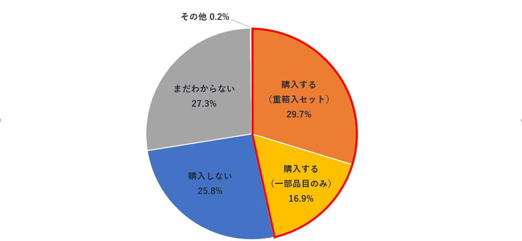 「購入する」と回答した人は「重箱入セット」と「一部品目のみ」を合わせて46.6%。約半数が半年前から来年のお正月におせちを購入する予定であると回答しており、おせちは季節イベントに欠かせない食事であることが窺える。