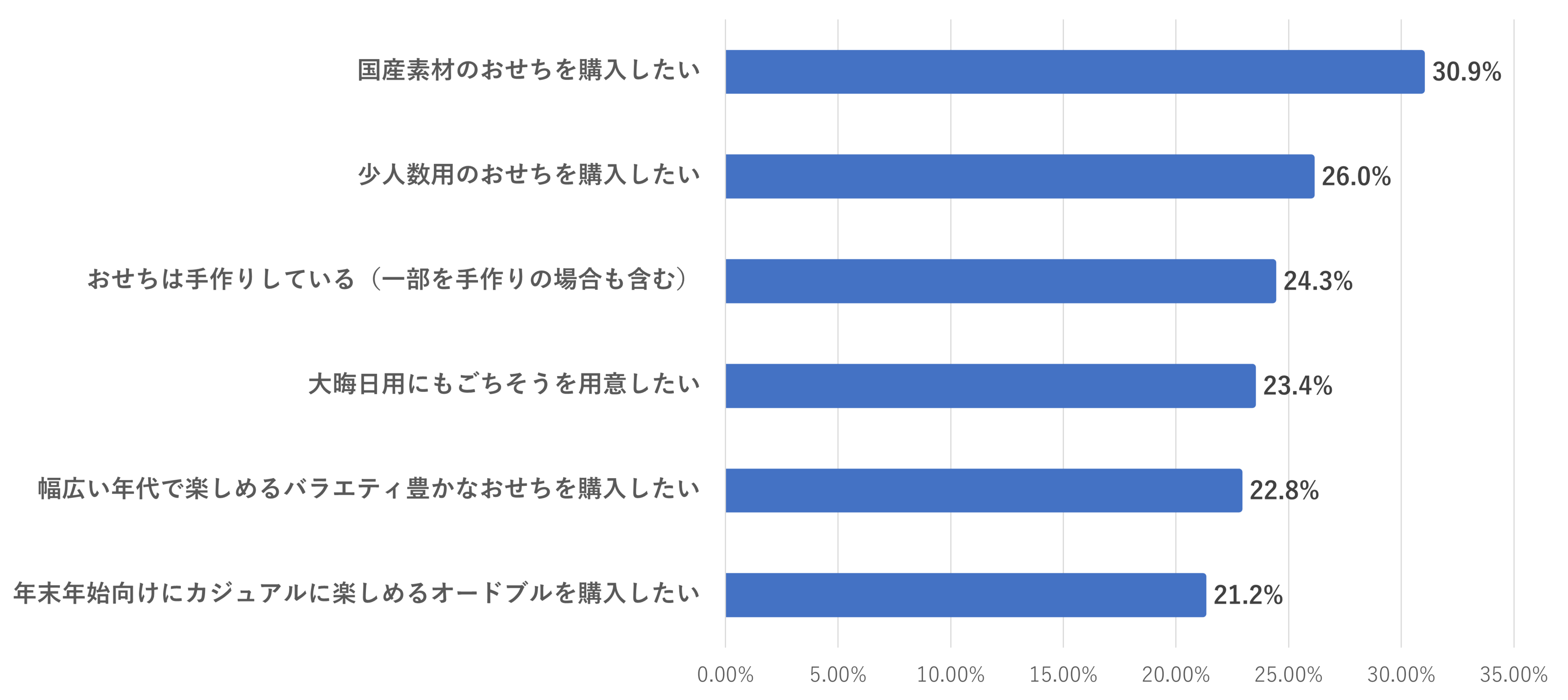お正月や年末の料理は「国産素材のおせち」(30.9%)や「少人数のおせち」(26.0%)が人気。中には「大晦日用にごちそうを用意したい」「年末年始向けにカジュアルに楽しめるオードブルを購入したい」といった回答もそれぞれ約20%あり、伝統的なおせちに代わってごちそうやオードブルなどカジュアルな食事を準備される方も多いようだ。