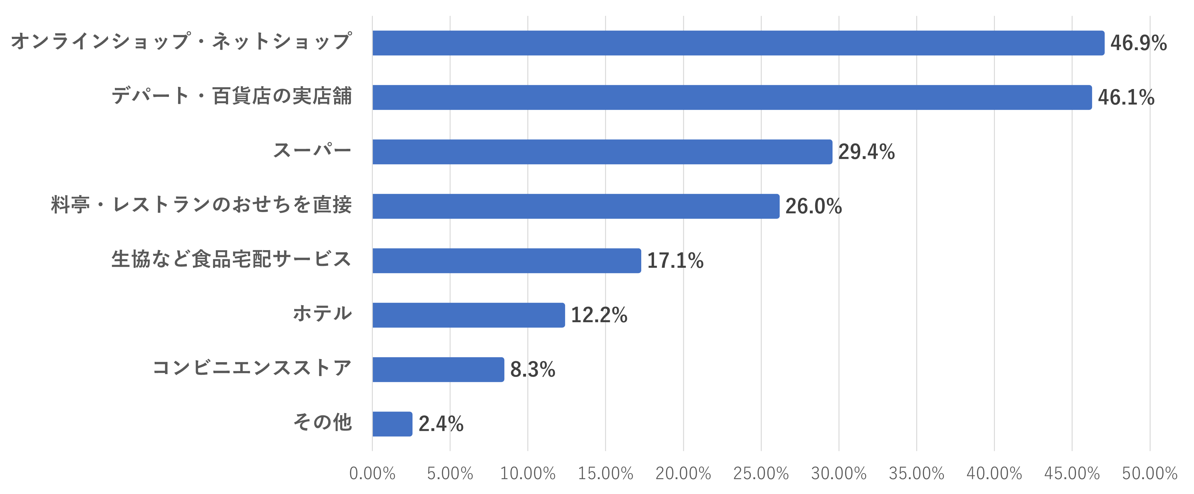 おせちの購入場所は「オンラインショップ・ネットショップ」(46.9%)がトップで、「デパート・百貨店の実店舗」(46.1%)が僅差で続く。さまざまな種類のおせちを比較検討し、お気に入りの逸品を選ぶには、オンラインショップや百貨店はうってつけだ。